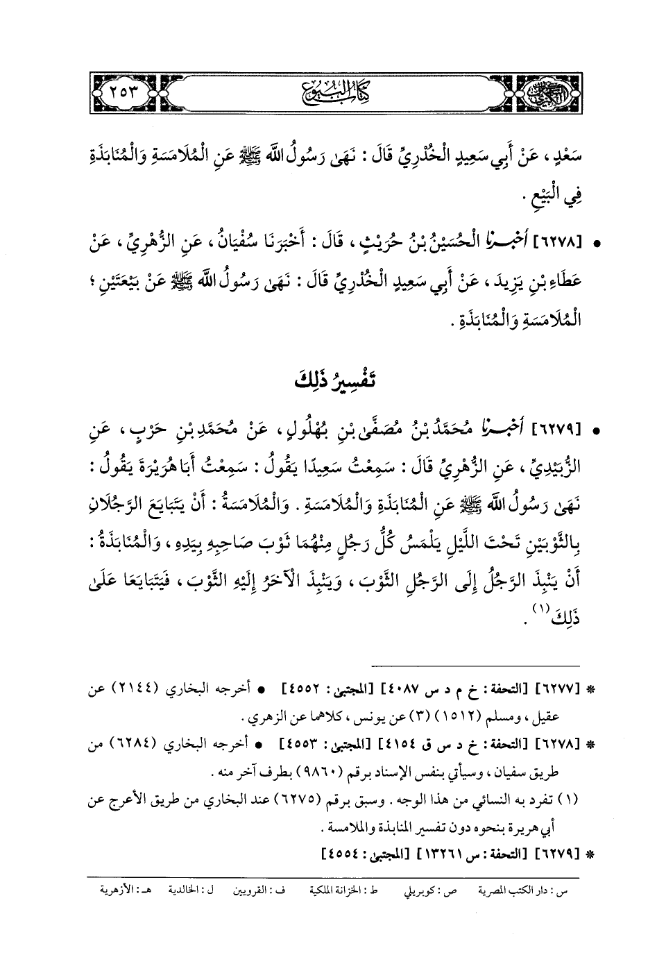 6279- أَخبَرنا مُحَمدُ بنُ مُصَفَّى بنِ بُهْلُولٍ، عَن مُحَمدِ بنِ حَرْبٍ، عَنِ الزُّبَيْدِيِّ، عَنِ الزُّهْرِيِّ، قَالَ: سَمِعْتُ سَعِيدًا يَقُولُ: سَمِعْتُ أَبَا هُرَيرَةَ يَقُولُ: نَهَى رَسُولُ اللهِ صَلى الله عَليه وسَلم عَنِ المُنَابَذَةِ وَالمُلامَسَةِ، وَالمُلامَسَةُ: أَنْ يَتَبَايَعَ الرَّجُلانِ بِالثَّوْبَيْنِ تَحْتَ اللَّيْلِ، يَلْمِسُ كُلُّ رَجُلٍ مِنْهُمَا ثَوْبَ صَاحِبِهِ بِيَدِهِ، وَالمُنَابَذَةُ: أَنْ يَنْبِذَ الرَّجُلُ إِلَى الرَّجُلِ الثَّوْبَ، وَيَنْبِذَ الآخَرُ إِلَيْهِ الثَّوْبَ فَيَتَبَايَعَا عَلَى ذَلِكَ.