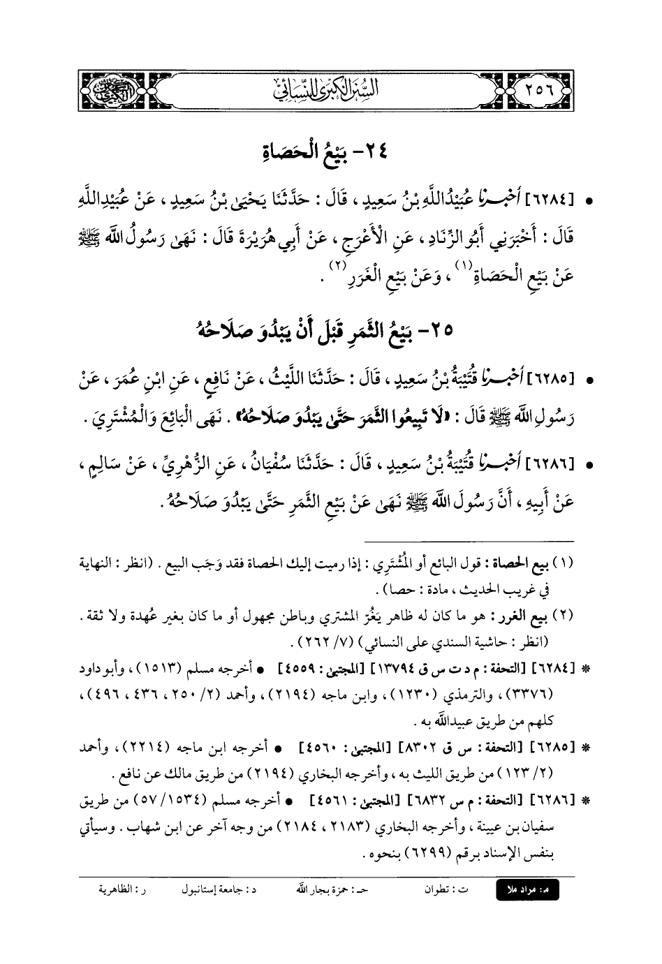 6285- أَخبَرنا قُتَيبَةُ بنُ سَعِيدٍ، قَالَ: حَدثنا اللَّيْثُ، عَن نَافِعٍ، عَنِ ابنِ عُمَرَ، عَن رَسُولِ اللهِ صَلى الله عَليه وسَلم، قَالَ: لا تَبِيعُوا الثَّمَرَ حَتَّى يَبْدُوَ صَلاحُهُ، نَهَى البَائِعَ وَالمُشْتَرِيَ.