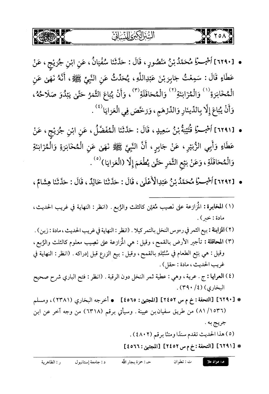 6291- أَخبَرنا قُتَيبَةُ بنُ سَعِيدٍ، قَالَ: حَدثنا المُفَضَّلُ، عَنِ ابنِ جُرَيْجٍ، عَن عَطَاءٍ، وَأَبي الزُّبَيْرِ، عَن جَابِرٍ، أَنَّ النَّبيَّ صَلى الله عَليه وسَلم نَهَى عَنِ المُخَابَرَةِ، وَالمُزَابَنَةِ، وَالمُحَاقَلَةِ، وَعَن بَيْعِ الثَّمَرِ حَتَّى يُطْعِمَ إِلاَّ العَرَايَا.