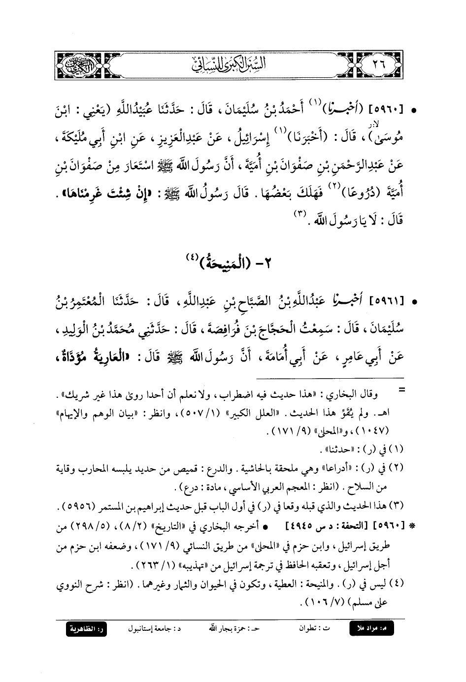 5960- أَخبَرنا أَحْمَدُ بنُ سُلَيمَانَ، قَالَ: حَدثنا عُبَيدُ اللهِ، يَعْنِي ابنَ مُوسَى، قَالَ: أَخبَرنا إِسرَائِيلُ، عَن عَبدِ العَزِيزِ، عَنِ ابنِ أَبي مُلَيْكَةَ، عَن عَبدِ الرَّحمَنِ بنِ صَفْوَانَ بنِ أُمَيَّةَ، أَنَّ رَسُولَ اللهِ صَلى الله عَليه وسَلم اسْتَعَارَ مِنْ صَفْوَانَ بنِ أُمَيَّةَ دُرُوعًا، فَهَلَكَ بَعْضُهَا، قَالَ رَسُولُ اللهِ صَلى الله عَليه وسَلم: إِنْ شِئْتَ غَرِمْنَاهَا، قَالَ: لا يَا رَسُولَ اللهِ.