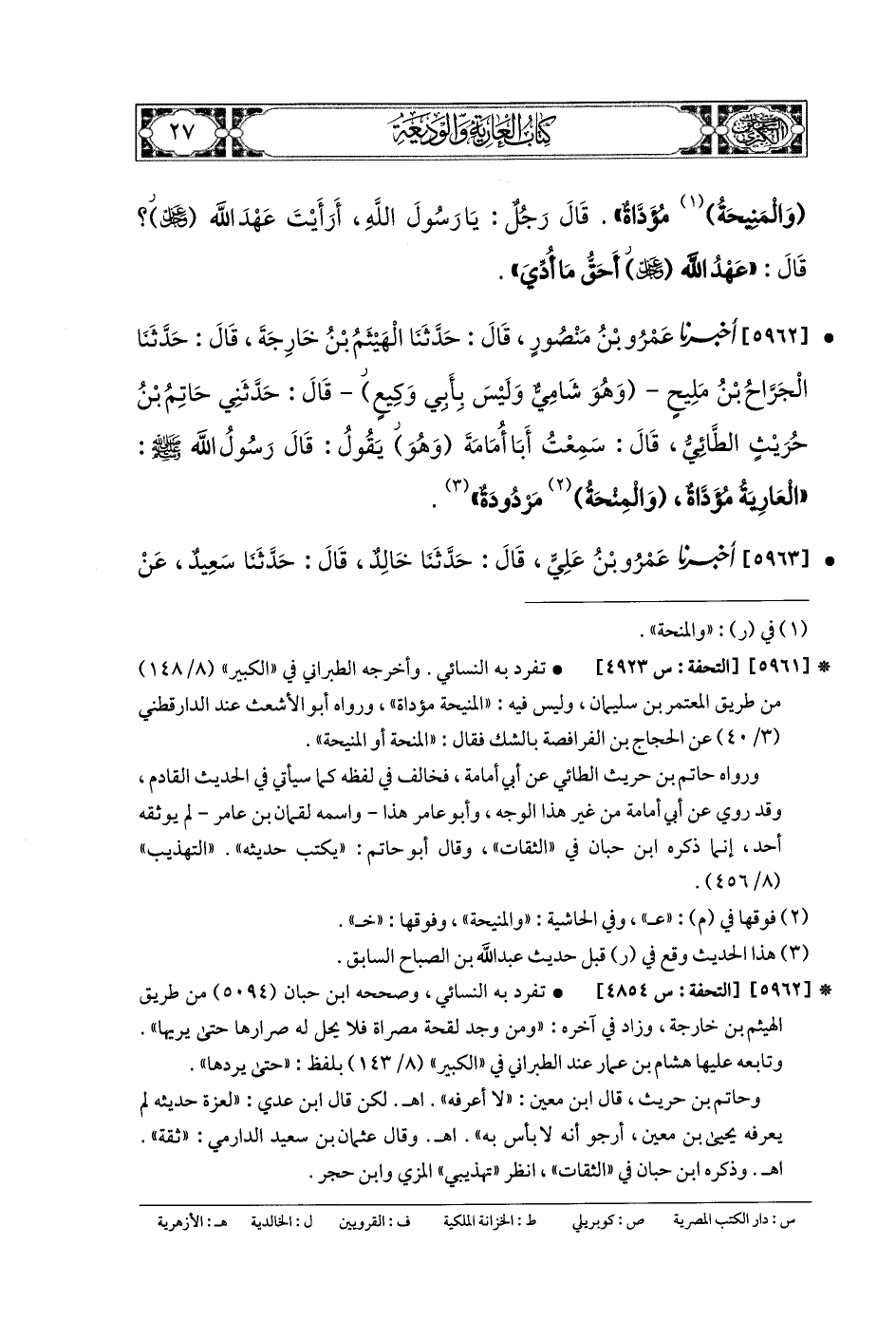 5962- أَخبَرنا عَمْرُو بنُ مَنصُورٍ، قَالَ: حَدثنا الهَيْثَمُ بنُ خَارِجَةَ، قَالَ: حَدثنا الجَرَّاحُ بنُ مَلِيحٍ، وَهُوَ شَامِيٌّ، وَلَيْسَ بِأَبي وَكِيعٍ، قَالَ: حَدَّثني حَاتِمُ بنُ حُرَيْثٍ الطَّائِيُّ، قَالَ: سَمِعْتُ أَبَا أُمَامَةَ وهو يَقُولُ: قَالَ رَسُولُ اللهِ صَلى الله عَليه وسَلم: العَارِيَةُ مُؤَدَّاةٌ، وَالمَنِحَةٌ مَرْدُودَةٌ.