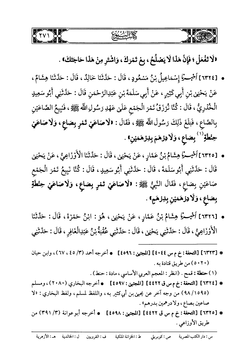 6325- أَخبَرنا هِشَامُ بنُ عَمَّارٍ، عَن يَحيَى، قَالَ: حَدثنا الأَوْزَاعِيُّ، عَن يَحيَى، قَالَ: حَدَّثني أَبو سَلَمَةَ، قَالَ: حَدَّثني أَبو سَعِيدٍ، قَالَ: كُنَّا نَبِيعُ تَمْرَ الجَمْعِ صَاعَيْنِ بِصَاعٍ، فَقَالَ النَّبيُّ صَلى الله عَليه وسَلم: لا صَاعَيْ تَمْرٍ بِصَاعٍ، وَلا صَاعَيْ حِنْطَةٍ بِصَاعٍ، وَلا دِرْهَمَيْنِ بِدِرْهَمٍ.