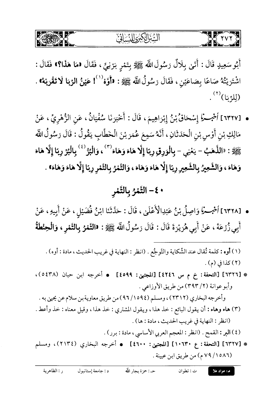 6327- أَخبَرنا إِسحَاقُ بنُ إِبرَاهِيمَ، قَالَ: أَخبَرنا سُفيانُ، عَنِ الزُّهْرِيِّ، عَن مَالِكِ بنِ أَوْسِ بنِ الحَدَثَانِ، أَنَّهُ سَمِعَ عُمَرَ بْنَ الخَطَّابِ يَقُولُ: قَالَ رَسُولُ اللهِ صَلى الله عَليه وسَلم: الذَّهَبُ، يَعْنِي بِالوَرِقِ، رِبًا إِلاَّ هَاءَ وَهَاءَ، وَالبُرُّ بِالبُرِّ رَبًّا إِلاَّ هَاءَ وَهَاءَ، وَالشَّعِيرُ بِالشَّعِيرِ رَبًّا إِلاَّ هَاءَ وَهَاءَ، وَالتَّمْرُ بِالتَّمْرِ رَبًّا إِلاَّ هَاءَ وَهَاءَ.