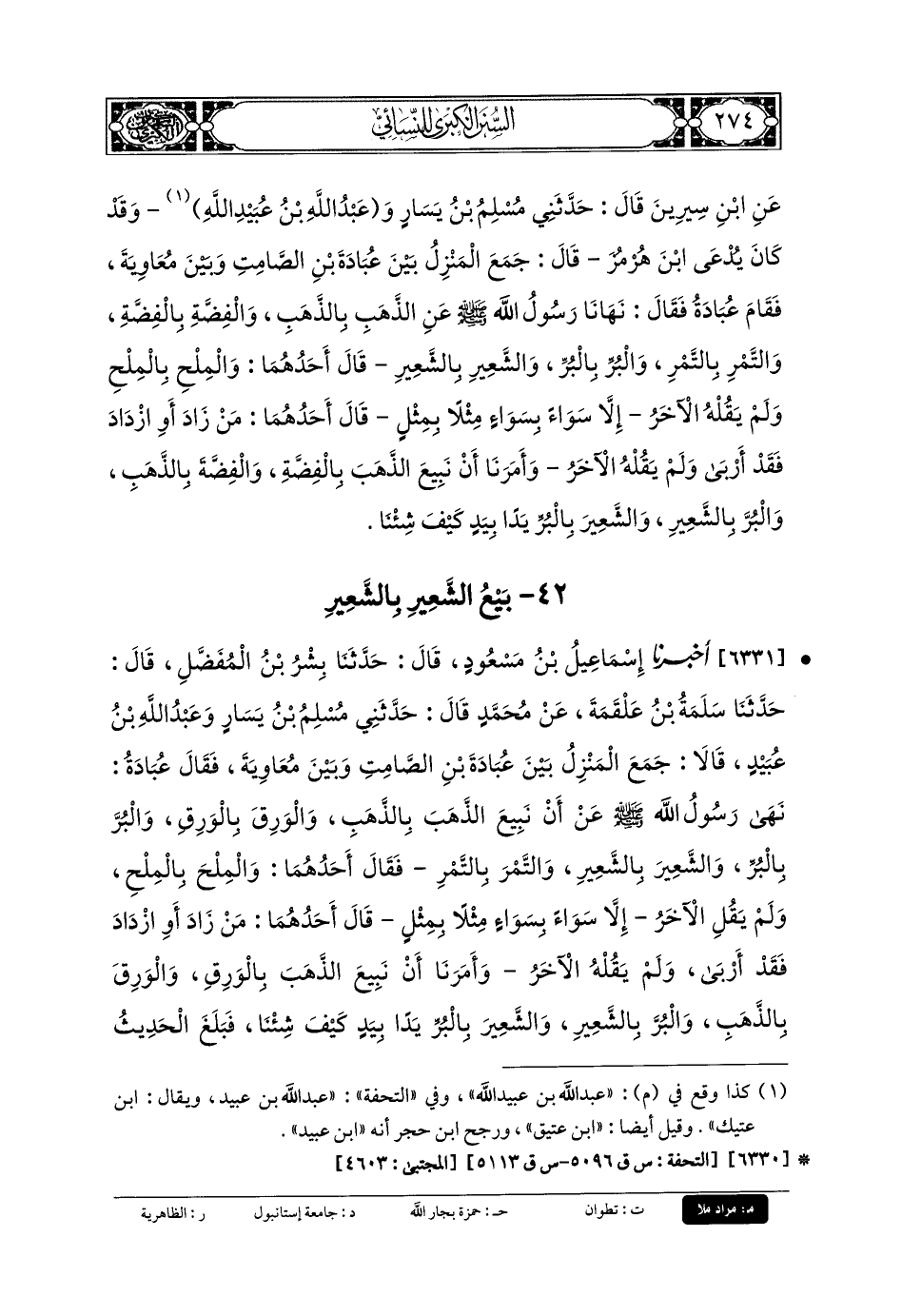 6331- أَخبَرنا إِسمَاعِيلُ بنُ مَسْعُودٍ، قَالَ: حَدثنا بِشْرُ بنُ المُفَضَّلِ، قَالَ: حَدثنا سَلَمَةُ بنُ عَلْقَمَةَ، عَن مُحَمدٍ، قَالَ: حَدَّثني مُسْلِمُ بنُ يَسَارٍ، وَعَبدُ اللهِ بنُ عُبَيدٍ قَالا: جَمَعَ المَنْزِلُ بَيْنَ عُبَادَةَ بنِ الصَّامِتِ وَبَيْنَ مُعاويَةَ، فَقَالَ عُبَادَةُ: نَهَى رَسُولُ اللهِ صَلى الله عَليه وسَلم عَن أَنْ نَبِيعَ الذَّهَبَ بِالذَّهَبِ، وَالوَرِقَ بِالوَرِقِ، وَالبُرَّ بِالبُرِّ، وَالشَّعِيرَ بِالشَّعِيرِ، وَالتَّمْرَ بِالتَّمْرِ، فَقَالَ أَحَدُهُمَا: وَالمِلْحَ بِالمِلْحِ، وَلَمْ يَقُلِ الآخَرُ، إِلاَّ سَوَاءً بِسَوَاءٍ، مِثْلاً بِمِثْلٍ، قَالَ أَحَدُهُمَا: مَنْ زَادَ أَوِ ازْدَادَ، فَقَدْ أَرْبَى، وَلَمْ يَقُلْهُ الآخَرُ، وَأَمَرَنَا أَنْ نَبِيعَ الذَّهَبَ بِالوَرِقِ، وَالوَرِقَ بِالذَّهَبِ، وَالبُرَّ بِالشَّعِيرِ، وَالشَّعِيرَ بِالبُرِّ يَدًا بِيَدٍ، كَيْفَ شِئْنَا، فَبَلَغَ الحَدِيثُ مُعاويَةَ، فَقَامَ، فَقَالَ: مَا بَالُ رِجَالٍ يُحَدِّثُونَ أَحَادِيثَ عَن رَسُولِ اللهِ صَلى الله عَليه وسَلم، قَدْ صَحِبْنَاهُ، فَلَمْ نَسْمَعْهَا مِنْهُ، فَبَلَغَ ذَلِكَ عُبَادَةَ، فَقَامَ فَأَعَادَ الحَدِيثَ، وَقَالَ: لَنُحَدِّثَنَّ بِمَا سَمِعْنَا مِنْ رَسُولِ اللهِ صَلى الله عَليه وسَلم، وَإِنْ رَغِمَ مُعاويَةُ.