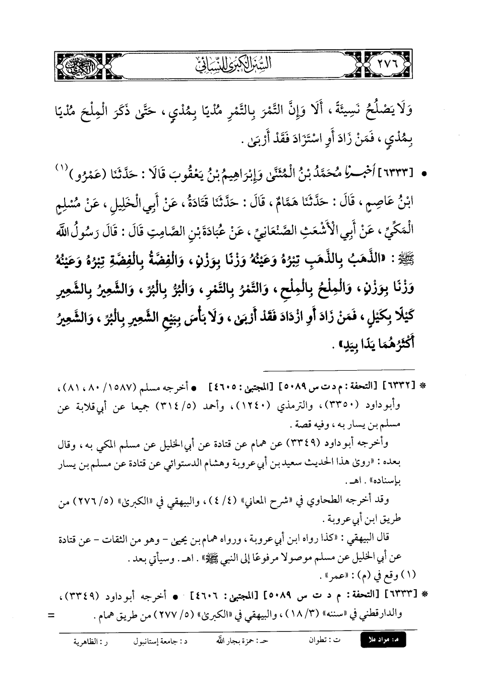 6333- أَخبَرنا مُحَمدُ بنُ المُثَنَّى، وَإِبرَاهِيمُ بنُ يَعْقُوبَ، قَالا: حَدثنا عَمْرُو بنُ عَاصِمٍ، قَالَ: حَدثنا هَمَّامٌ، قَالَ: حَدثنا قَتَادَةُ، عَن أَبي الخَلِيلِ، عَن مُسْلِمٍ المَكِّيِّ، عَن أَبي الأَشْعَثِ الصَّنْعَانِيِّ، عَن عُبَادَةَ بنِ الصَّامِتِ، قَالَ: قَالَ رَسُولُ اللهِ صَلى الله عَليه وسَلم: الذَّهَبُ بِالذَّهَبِ، تِبْرُهُ وَعَيْنُهُ، وَزْنًا بِوَزْنٍ، وَالفِضَّةُ بِالفِضَّةِ، تِبْرُهُ وَعَيْنُهُ، وَزْنًا بِوَزْنٍ، وَالمِلْحُ بِالمِلْحِ، وَالتَّمْرُ بِالتَّمْرِ، وَالبُرُّ بِالبُرِّ، وَالشَّعِيرُ بِالشَّعِيرِ، كَيْلاً بِكَيْلٍ، فَمَنْ زَادَ أَوِ ازْدَادَ فَقَدْ أَرْبَى، وَلا بَأْسَ بِبَيْعِ الشَّعِيرِ بِالبُرِّ، وَالشَّعِيرُ أَكْثَرُهُمَا يَدًا بِيَدٍ.