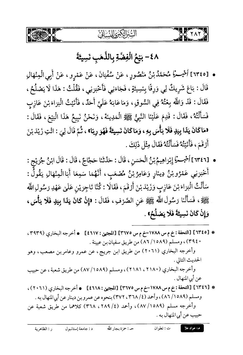 6346- أَخبَرنا إِبرَاهِيمُ بنُ الحَسَنِ، قَالَ: حَدثنا حَجَّاجٌ، قَالَ: قَالَ ابنُ جُرَيْجٍ: أَخبَرني عَمْرُو بنُ دِينَارٍ، وَعَامِرُ بنُ مُصْعَبٍ، أَنَّهُمَا سَمِعَا أَبَا المِنْهَالِ يَقُولُ: سَأَلْتُ البَرَاءَ بْنَ عَازِبٍ، وَزَيْدَ بْنَ أَرْقَمَ، فَقَالا: كُنَّا تَاجِرَيْنِ عَلَى عَهْدِ رَسُولِ اللهِ صَلى الله عَليه وسَلم، فَسَأَلْنَا رَسُولَ اللهِ صَلى الله عَليه وسَلم عَنِ الصَّرْفِ، فَقَالَ: إِنْ كَانَ يَدًا بَيْدٍ فَلا بَأْسَ، وَإِنْ كَانَ نَسِيئَةً فَلا يَصْلُحُ.