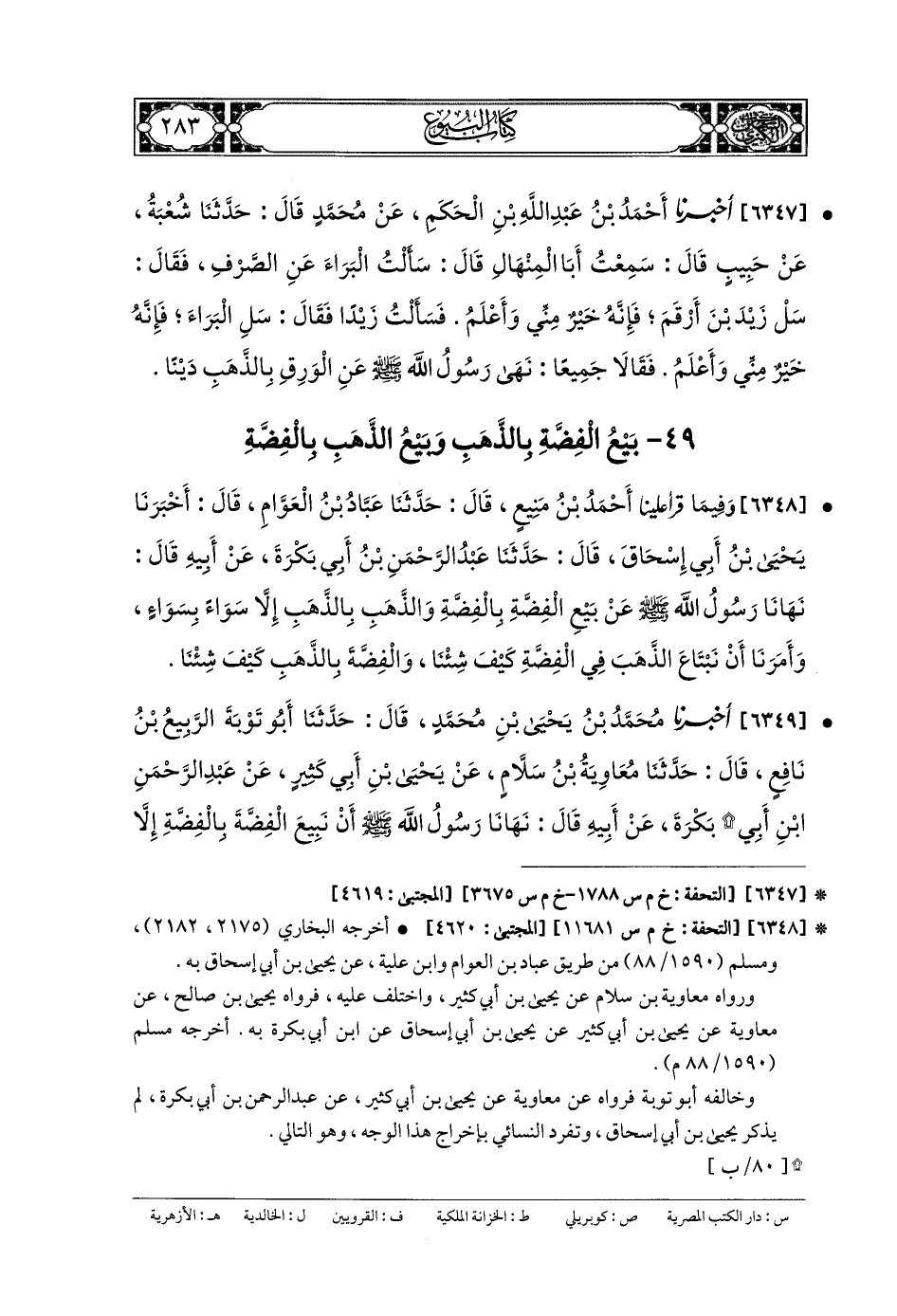 (1) في طبعة التأصيل: « تَبَايَعُوا الذَّهَبَ في الفِضَّةِ كَيْفَ شِئْتُمْ، وَالفِضَّةَ في الذَّهَبِ» وهو على الصواب في طبعة الرسالة (6127)، و«المُجتبى» طبعة التجارية (4579).