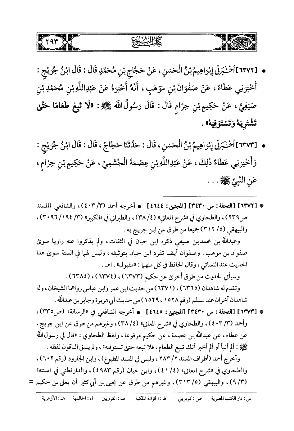 6372- أَخبَرني إِبرَاهِيمُ بنُ الحَسَنِ، عَن حَجَّاجِ بنِ مُحَمدٍ، قَالَ: قَالَ ابنُ جُرَيْجٍ: أَخبَرني عَطَاءٌ، عَن صَفْوَانَ بنِ مَوْهَبٍ، أَنَّهُ أَخْبَرَهُ عَن عَبدِ اللهِ بنِ مُحَمدِ بنِ صَيْفِيٍّ، عَن حَكِيمِ بنِ حِزَامٍ، قَالَ: قَالَ رَسُولُ اللهِ صَلى الله عَليه وسَلم: لا تَبِعْ طَعَامًا حَتَّى تَشْتَرِيَهُ وَتَسْتَوْفِيَهُ.