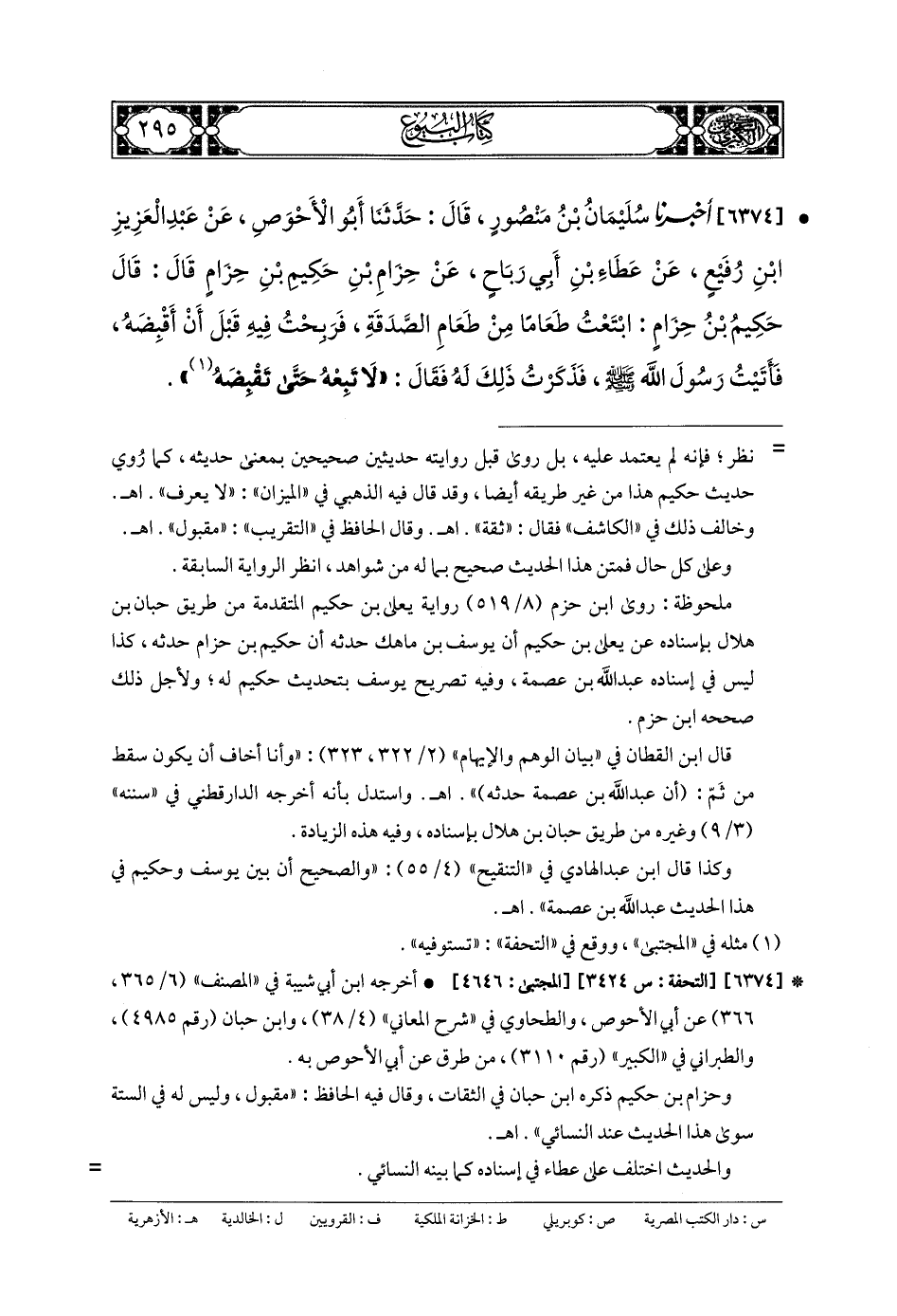 6374- أَخبَرنا سُلَيمَانُ بنُ مَنصُورٍ، قَالَ: حَدثنا أَبو الأَحْوَصِ، عَن عَبدِ العَزِيزِ بنِ رُفَيْعٍ، عَن عَطَاءِ بنِ أَبي رَبَاحٍ، عَن حِزَامِ بنِ حَكِيمِ بنِ حِزَامٍ، قَالَ: قَالَ حَكِيمُ بنُ حِزَامٍ: ابْتَعْتُ طَعَامًا مِنْ طَعَامِ الصَّدَقَةِ، فَرَبِحْتُ فِيهِ قَبْلَ أَنْ أَقْبِضَهُ، فَأَتَيْتُ رَسُولَ اللهِ صَلى الله عَليه وسَلم فَذَكَرْتُ ذَلِكَ لَهُ، فَقَالَ: لا تَبِعْهُ حَتَّى تَقْبِضَهُ.