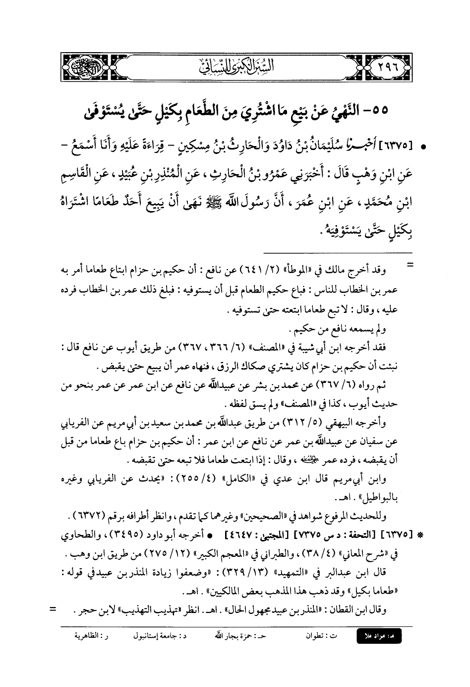 6375- أَخبَرنا سُلَيمَانُ بنُ دَاوُدَ، وَالحَارِثُ بنُ مِسْكِينٍ، قِرَاءَةً عَلَيْهِ، وَأَنَا أَسْمَعُ، عَنِ ابنِ وَهْبٍ، قَالَ: أَخبَرني عَمْرُو بنُ الحَارِثِ، عَنِ المُنْذِرِ بنِ عُبَيدٍ، عَنِ القَاسِمِ بنِ مُحَمدٍ، عَنِ ابنِ عُمَرَ، أَنَّ رَسُولَ اللهِ صَلى الله عَليه وسَلم نَهَى أَنْ يَبِيعَ أَحَدٌ طَعَامًا اشْتَرَاهُ بِكَيْلٍ حَتَّى يَسْتَوْفِيَهُ.