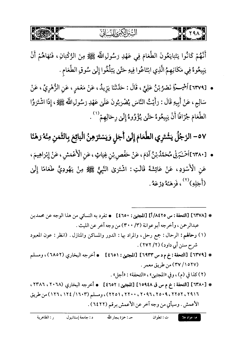 6380- أَخبَرني مُحَمدُ بنُ آدَمَ، عَن حَفْصِ بنِ غِيَاثٍ، عَنِ الأَعْمَشِ، عَن إِبرَاهِيمَ، عَنِ الأَسْوَدِ، عَن عَائِشَةَ، قَالَتِ: اشْتَرَى النَّبيُّ صَلى الله عَليه وسَلم مِنْ يَهُودِيٍّ طَعَامًا إِلَى أَجَله، فَرَهَنَهُ دِرْعَهُ.