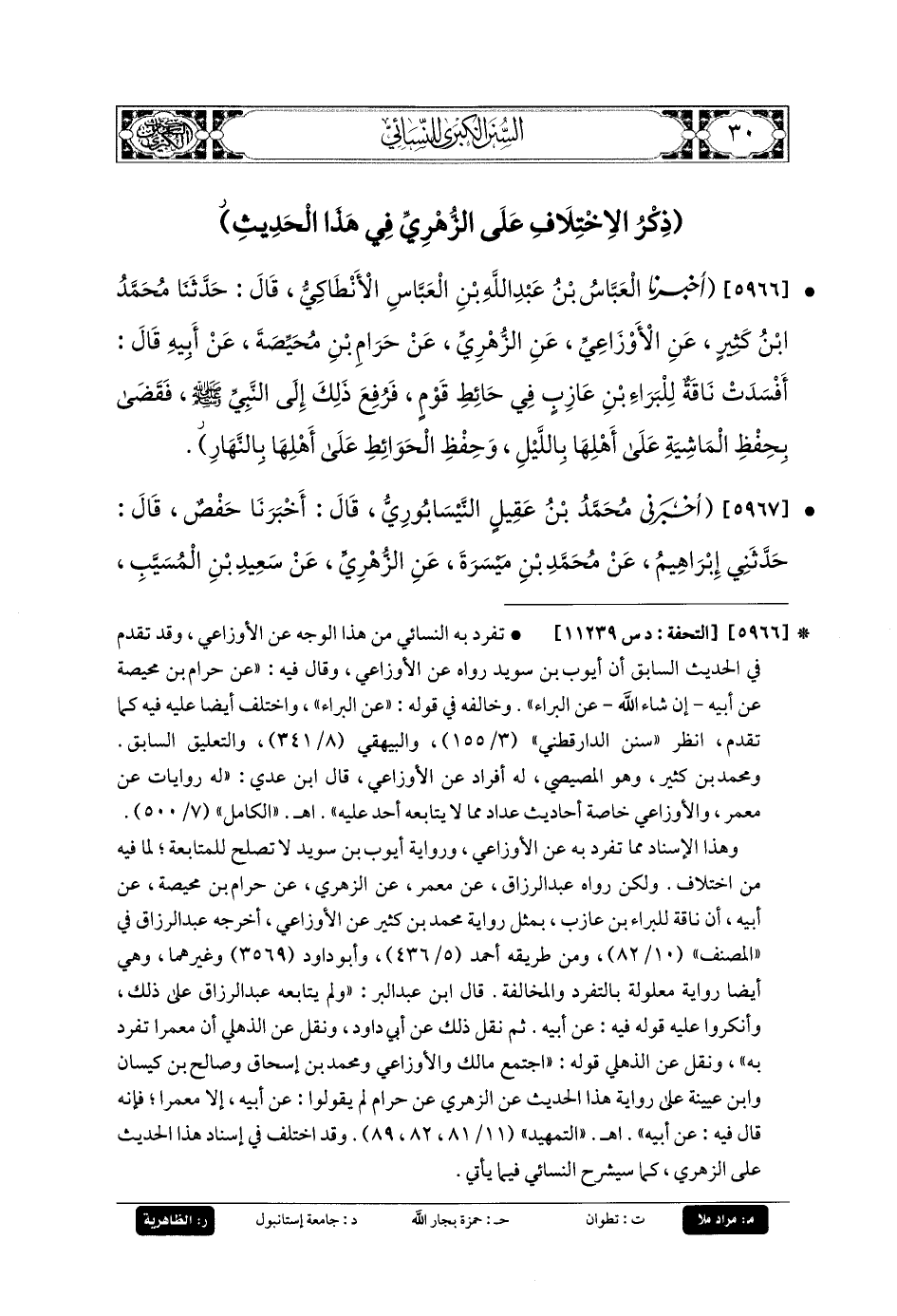 5966- أَخبَرنا العَبَّاسُ بنُ عَبدِ اللهِ بنِ العَبَّاسِ الأَنْطَاكِيُّ، قَالَ: حَدثنا مُحَمدُ بنُ كَثِيرٍ، عَنِ الأَوْزَاعِيِّ، عَنِ الزُّهْرِيِّ، عَنِ حَرَامِ بنِ مُحَيِّصَةَ، عَن أَبيهِ، قَالَ: أَفْسَدَتْ نَاقَةٌ لِلْبَرَاءِ بنِ عَازِبٍ فِي حَائِطِ قَوْمٍ، فَرُفِعَ ذَلِكَ إِلَى النَّبيِّ صَلى الله عَليه وسَلم، فَقَضَى بِحِفْظِ المَاشِيَةِ عَلَى أَهْلِهَا بِاللَّيْلِ، وَحِفْظِ الحَوَائِطِ عَلَى أَهْلِهَا بِالنَّهَارِ.