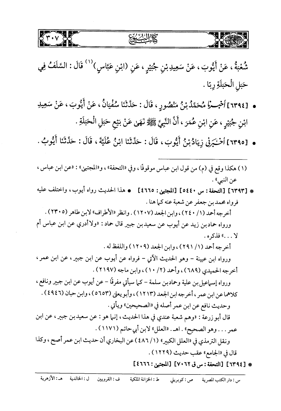 6395- أَخبَرني زِيَادُ بنُ أَيوبَ، قَالَ: حَدثنا ابنُ عُلَيَّةَ، قَالَ: حَدثنا أَيوبُ، وَأَخبَرنا قُتَيبَةُ بنُ سَعِيدٍ، قَالَ: حَدثنا حَمَّادٌ، عَن أَيوبَ، عَن نَافِعٍ، عَنِ ابنِ عُمَرَ، قَالَ: نَهَى رَسُولُ اللهِ صَلى الله عَليه وسَلم عَن بَيْعِ حَبَلِ الحَبَلَةِ.