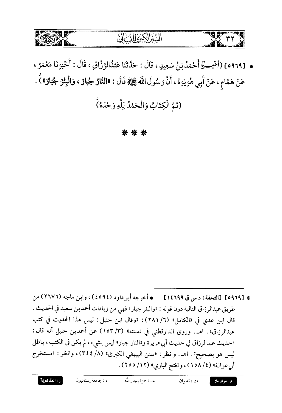5969- أَخبَرنا أَحْمَدُ بنُ سَعِيدٍ، قَالَ: حَدثنا عَبدُ الرَّزَّاقِ، قَالَ: أَخبَرنا مَعْمَرٌ، عَن هَمَّامٍ، عَن أَبي هُرَيرَةَ، أَنَّ رَسُولَ اللهِ صَلى الله عَليه وسَلم قَالَ: النَّارُ جُبَارٌ وَالبِئْرُ جُبَارٌ.