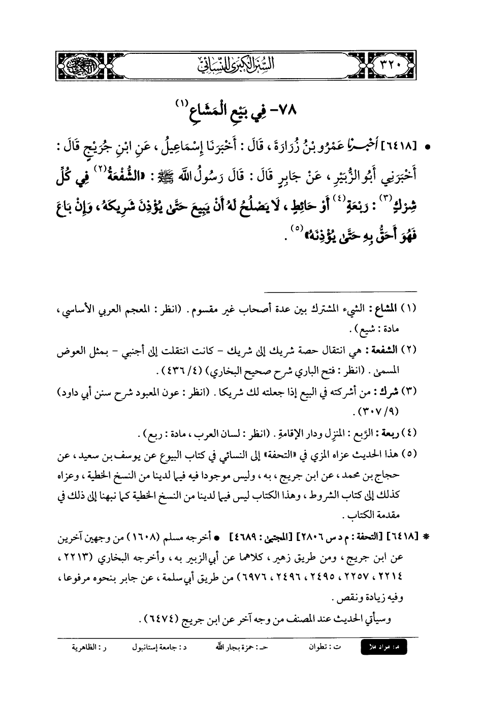 6418- أَخبَرنا عَمْرُو بنُ زُرَارَةَ، قَالَ: أَخبَرنا إِسمَاعِيلُ، عَنِ ابنِ جُرَيْجٍ، قَالَ: أَخبَرني أَبو الزُّبَيْرِ، عَن جَابِرٍ، قَالَ: قَالَ رَسُولُ اللهِ صَلى الله عَليه وسَلم: الشُّفْعَةُ فِي كُلِّ شِرْكٍ رَبْعَةٍ أَوْ حَائِطٍ لا يَصْلُحُ لَهُ أَنْ يَبِيعَ حَتَّى يُؤْذِنَ شَرِيكَهُ، وإِنْ بَاعَ فَهُوَ أَحَقُّ بِهِ حَتَّى يُؤْذِنَهُ.