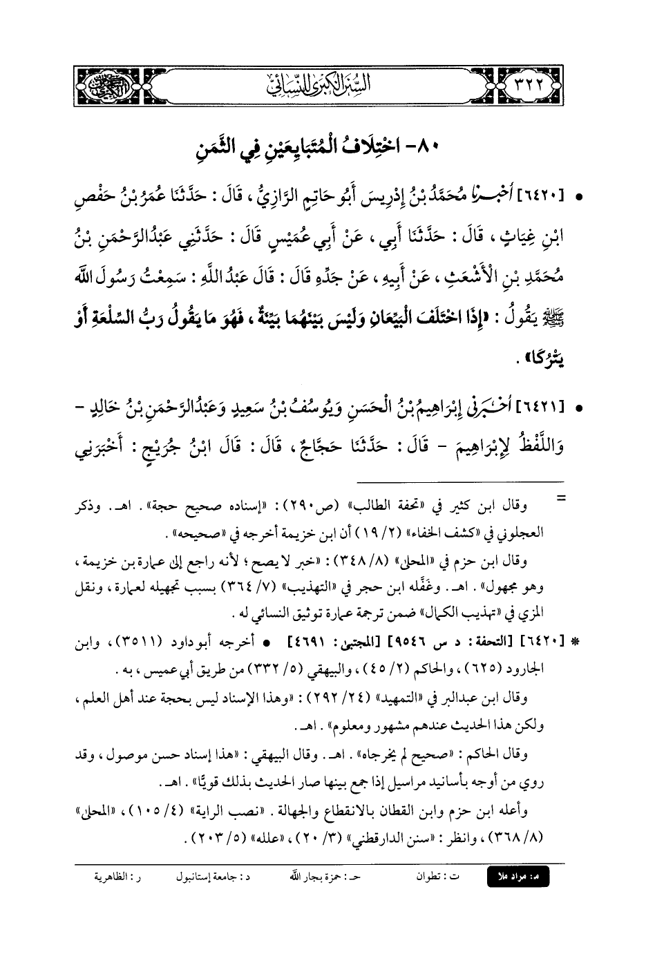 6421- أَخبَرني إِبرَاهِيمُ بنُ الحَسَنِ، وَيُوسُفُ بنُ سَعِيدٍ، وَعَبدُ الرَّحمَنِ بنُ خَالِدٍ، وَاللَّفْظُ لإِبرَاهِيمَ، قَال: حَدثنا حَجَّاجٌ، قَالَ: قَالَ ابنُ جُرَيْجٍ، أَخبَرني إِسمَاعِيلُ بنُ أُمَيَّةَ، عَن عَبدِ المَلِكِ بنِ عُبَيدٍة قَالَ: حَضَرْنَا أَبَا عُبَيدَةَ بْنَ عَبدِ اللهِ بنِ مَسْعُودٍ أَتَاهُ رَجُلانِ يتَبَايَعَا سِلْعَةً، فَقَالَ هَذَا: أَخَذْتُهَا بِكَذَا وَكَذَا، وَقَالَ هَذَا: بِعْتُهَا بِكَذَا وَكَذَا، فَقَالَ أَبو عُبَيدَةَ: أُتِيَ ابنُ مَسْعُودٍ فِي مِثْلِ هَذَا، فَقَالَ: حَضَرْتُ رَسُولَ اللهِ صَلى الله عَليه وسَلم أُتِيَ فِي مِثْلِ هَذَا، فَأَمَرَ البَائِعَ أَنْ يَسْتَحْلِفَ، ثُمَّ يَخْتَارَ المُبْتَاعُ، فَإِنْ شَاءَ أَخَذَ، وَإِنْ شَاءَ تَرَكَ.