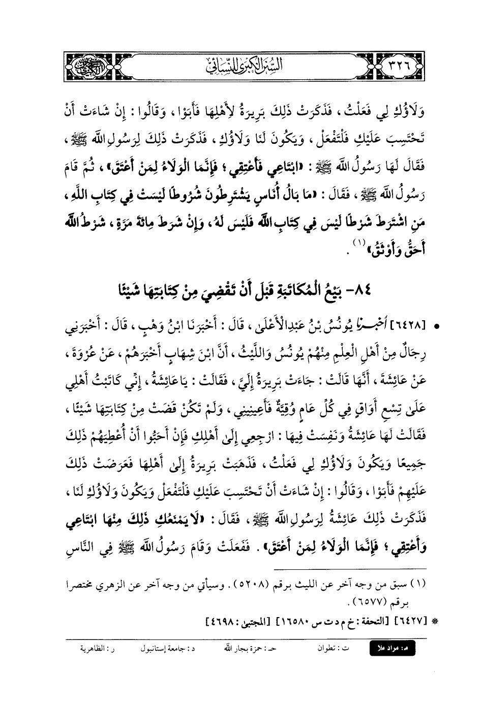 6428 - أَخبَرنا يُونُسُ بنُ عَبدِ الأَعْلَى، قَالَ: أَخبَرنا ابنُ وَهْبٍ، قَالَ: أَخبَرني رِجَالٌ مِنْ أَهْلِ العِلْمِ، مِنْهُمْ يُونُسُ، وَاللَّيْثُ، أَنَّ ابنَ شِهَابٍ أَخْبَرَهُمْ، عَن عُرْوَةَ، عَن عَائِشَةَ، أَنَّهَا قَالَتْ: جَاءَتْ بَرِيرَةُ إِلَيَّ، فَقَالَتْ: يَا عَائِشَةُ، إِنِّي كَاتَبْتُ أَهْلِي عَلَى تِسْعِ أَوَاقٍ فِي كُلِّ عَامٍ وُقِيَّةٌ، فَأَعِينِينِي، وَلَمْ تَكُنْ قَضَتْ مِنْ كِتَابَتِهَا شَيْئًا، فَقَالَتْ لَهَا عَائِشَةُ، وَنَفِسَتْ فِيهَا، ارْجِعِي إِلَى أَهْلِكِ، فَإِنْ أَحَبُّوا أَنْ أُعْطِيَهُمْ ذَلِكَ جَمِيعًا وَيَكُونَ وَلاؤُكِ لِي فَعَلْتُ، فَذَهَبَتْ بَرِيرَةُ إِلَى أَهْلِهَا، فَعَرَضَتْ ذَلِكَ عَلَيْهِمْ، فَأَبَوْا وَقَالُوا: إِنْ شَاءَتْ أَنْ تَحْتَسِبَ عَلَيْكِ فَلْتَفْعَلْ وَيَكُونَ ذَلِكَ لَنَا، فَذَكَرَتْ ذَلِكَ عَائِشَةُ لِرَسُولِ اللهِ صَلى الله عَليه وسَلم، فَقَالَ: لا يَمْنَعُكِ ذَلِكَ مِنْهَا، ابْتَاعِي وَأَعْتِقِي؛ فَإِنّمَا الوَلاءُ لِمَنْ أَعْتَقَ، فَفَعَلَتْ، وَقَامَ رَسُولُ اللهِ صَلى الله عَليه وسَلم في الناس، فَحَمِدَ اللهَ، ثُمَّ قَالَ: أَمَّا بَعْدُ، فَمَا بَالُ أُنَاسٍ يَشْتَرِطُونَ شُرُوطًا لَيْسَتْ فِي كِتَابِ اللهِ، مَنِ اشْتَرَطَ شَرْطًا لَيْسَ فِي كِتَابِ اللهِ فَهُوَ بَاطِلٌ، وَإِنْ كَانَ مِئَةَ شَرْطٍ، قَضَاءُ اللهِ أَحَقُّ، وَشَرْطُ اللهِ أَوْثَقُ، وَإِنَّمَا الوَلاءُ لِمَنْ أَعْتَقَ.