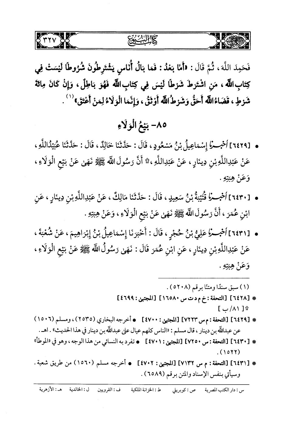 6430- أَخبَرنا قُتَيبَةُ بنُ سَعِيدٍ، قَالَ: حَدثنا مَالِكٌ، عَن عَبدِ اللهِ بنِ دِينَارٍ، عَنِ ابنِ عُمَرَ، أَنَّ رَسُولَ اللهِ صَلى الله عَليه وسَلم نَهَى عَن بَيْعِ الوَلاءِ، وَعَن هِبَتِهِ.
