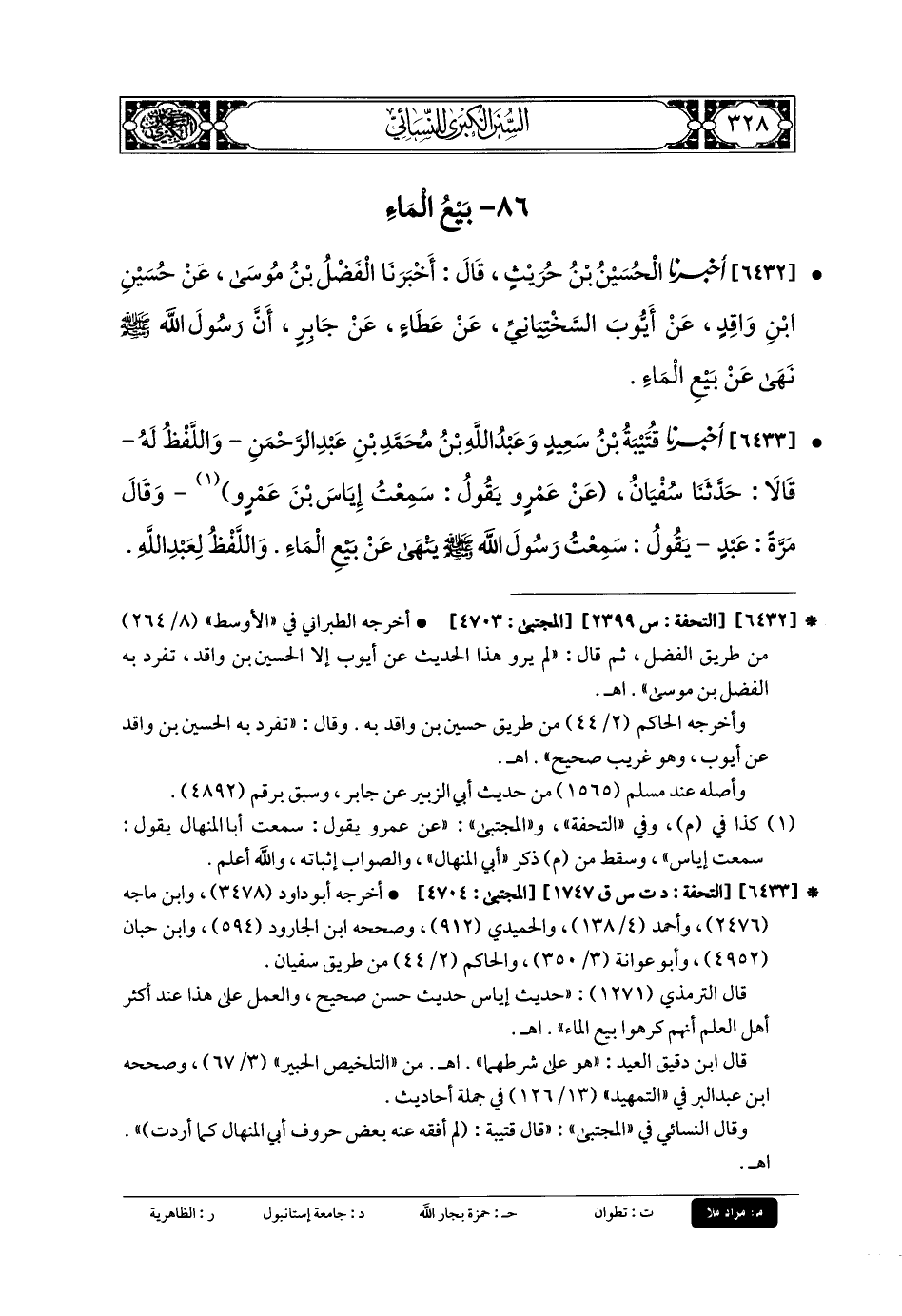 6433- أَخبَرنا قُتَيبَةُ بنُ سَعِيدٍ، وَعَبدُ اللهِ بنُ مُحَمدِ بنِ عَبدِ الرَّحمَنِ، وَاللَّفْظُ لَهُ، قَالا: حَدثنا سُفيانُ، عَن عَمْرِو، يَقُولُ: سَمِعْتُ أَبَا المِنْهَالِ: يَقُولُ: سَمِعْتُ إِيَاسَ بْنَ عَمْرٍو (1)، وَقَالَ مَرَّةً: عَبدٍ يَقُولُ: سَمِعْتُ رَسُولَ اللهِ صَلى الله عَليه وسَلم يَنْهَى عَن بَيْعِ المَاءِ.
