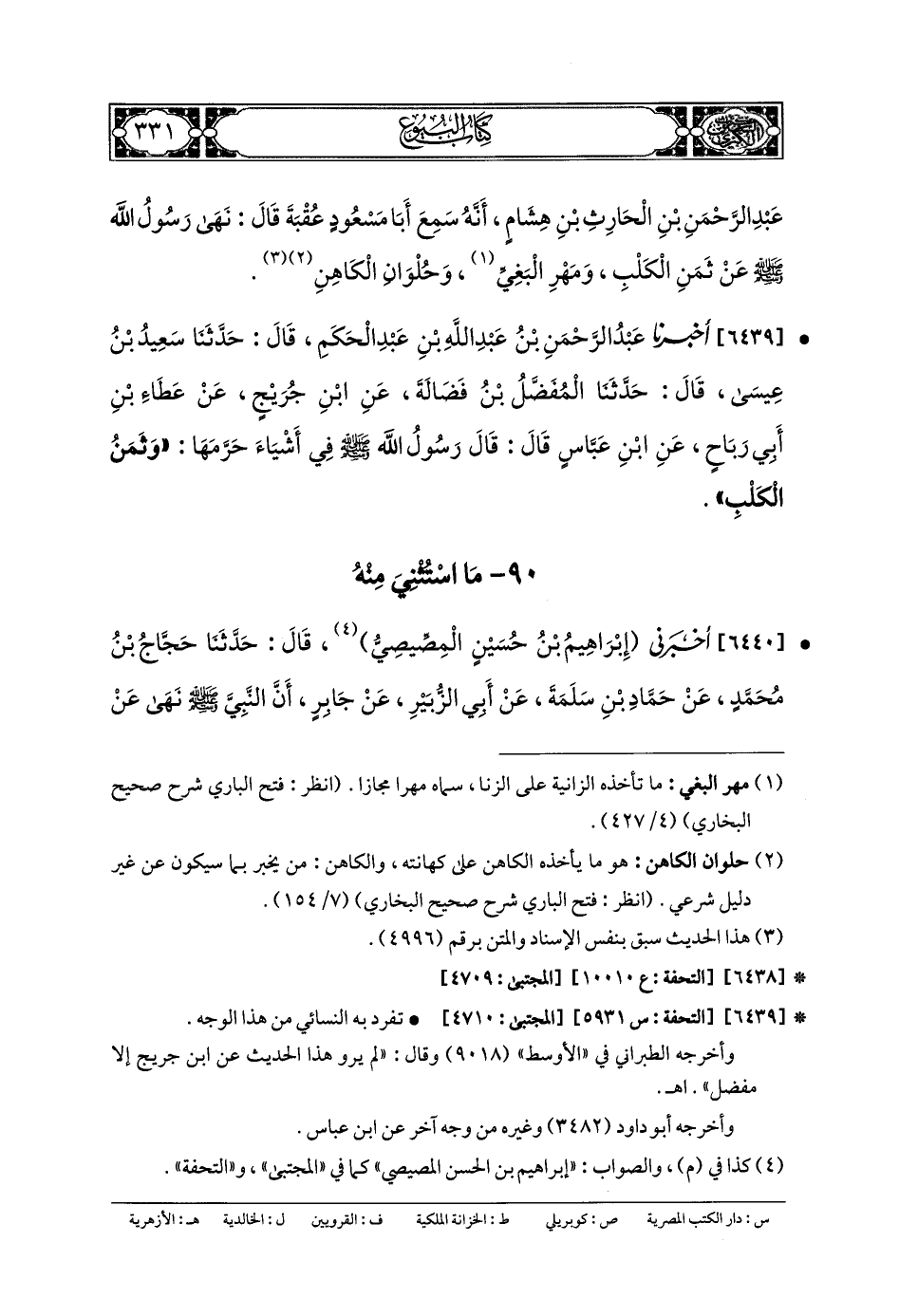 6440- أَخبَرني إِبرَاهِيمُ بنُ الحَسَنِ (1) المِصِّيصِيُّ، قَالَ: حَدثنا حَجَّاجُ بنُ مُحَمدٍ، عَن حَمَّادِ بنِ سَلَمَةَ، عَن أَبي الزُّبَيْرِ، عَن جَابِرٍ، أَنَّ النَّبيَّ صَلى الله عَليه وسَلم نَهَى عَن ثَمَنِ السِّنَّوْرِ، وَالكَلْبِ إِلاَّ كَلْبَ صَيْدٍ.