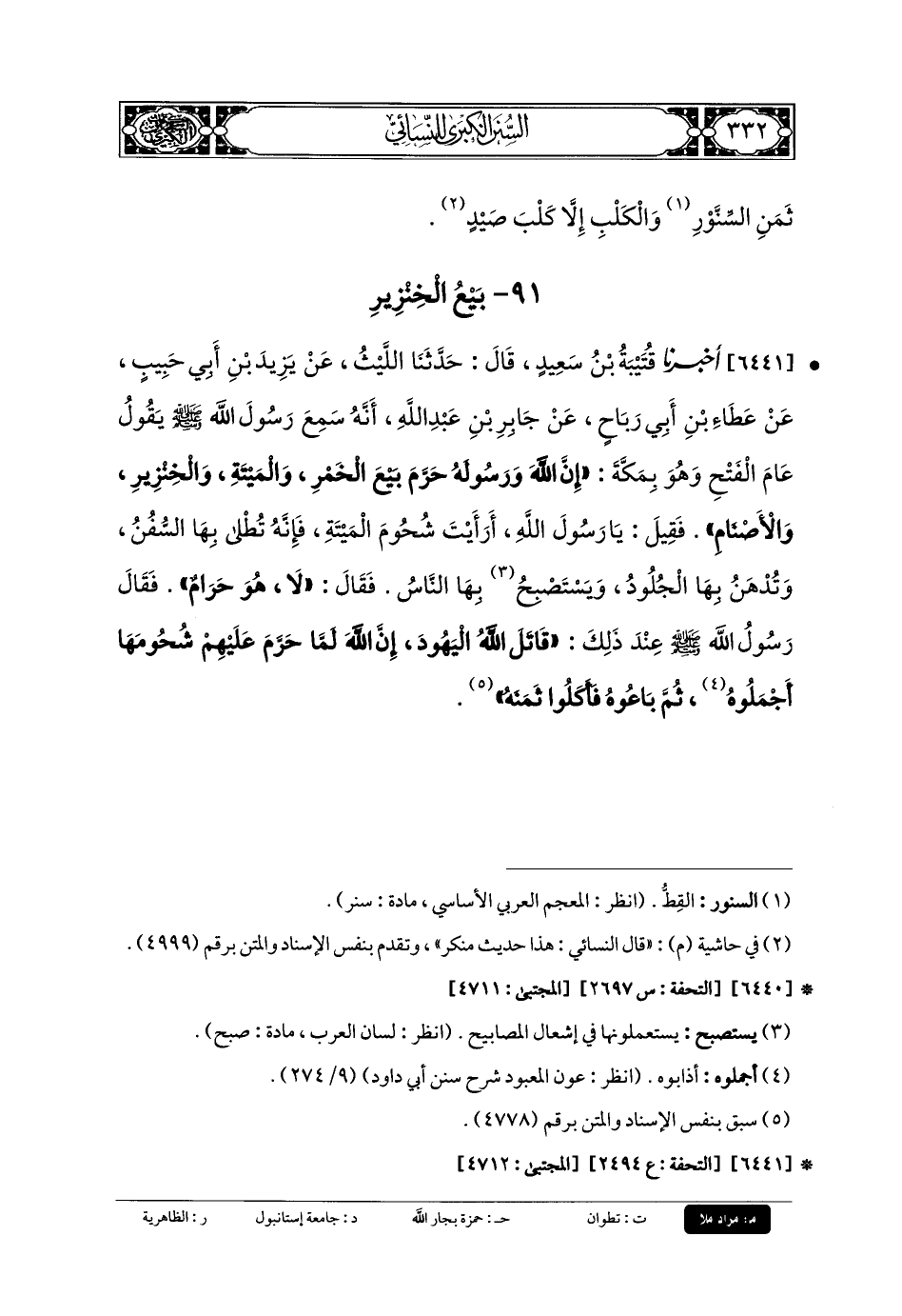 6441- أَخبَرنا قُتَيبَةُ بنُ سَعِيدٍ، قَالَ: حَدثنا اللَّيْثُ، عَن يَزِيدَ بنِ أَبي حَبِيبٍ، عَن عَطَاءِ بنِ أَبي رَبَاحٍ، عَن جَابِرِ بنِ عَبدِ اللهِ، أَنَّهُ سَمِعَ رَسُولَ اللهِ صَلى الله عَليه وسَلم يَقُولُ عَامَ الفَتْحِ، وَهُوَ بِمَكَّةَ: إِنَّ اللهَ وَرَسُولَهُ حَرَّمَ بَيْعَ الخَمْرِ، وَالمَيْتَةِ، وَالخِنْزِيرِ، وَالأَصْنَامِ، فَقِيلَ: يَا رَسُولَ اللهِ، أَرَأَيْتَ شُحُومَ المَيْتَةِ؛ فَإِنَّهُ تُطْلَى بِهَا السُّفُنُ، وَتُدْهَنُ بِهَا الجُلُودُ، وَيَسْتَصْبِحُ بِهَا النَّاسُ، فَقَالَ: لا، هُوَ حَرَامٌ، فَقَالَ رَسُولُ اللهِ صَلى الله عَليه وسَلم عِنْدَ ذَلِكَ: قَاتَلَ اللهُ اليَهُوَدَ؛ إِنَّ اللهَ لَمَّا حَرَّمَ عَلَيْهِمْ شُحُومَهَا أَجْمَلُوهُ، ثُمَّ بَاعُوهُ فَأَكَلُوا ثَمَنَهُ.