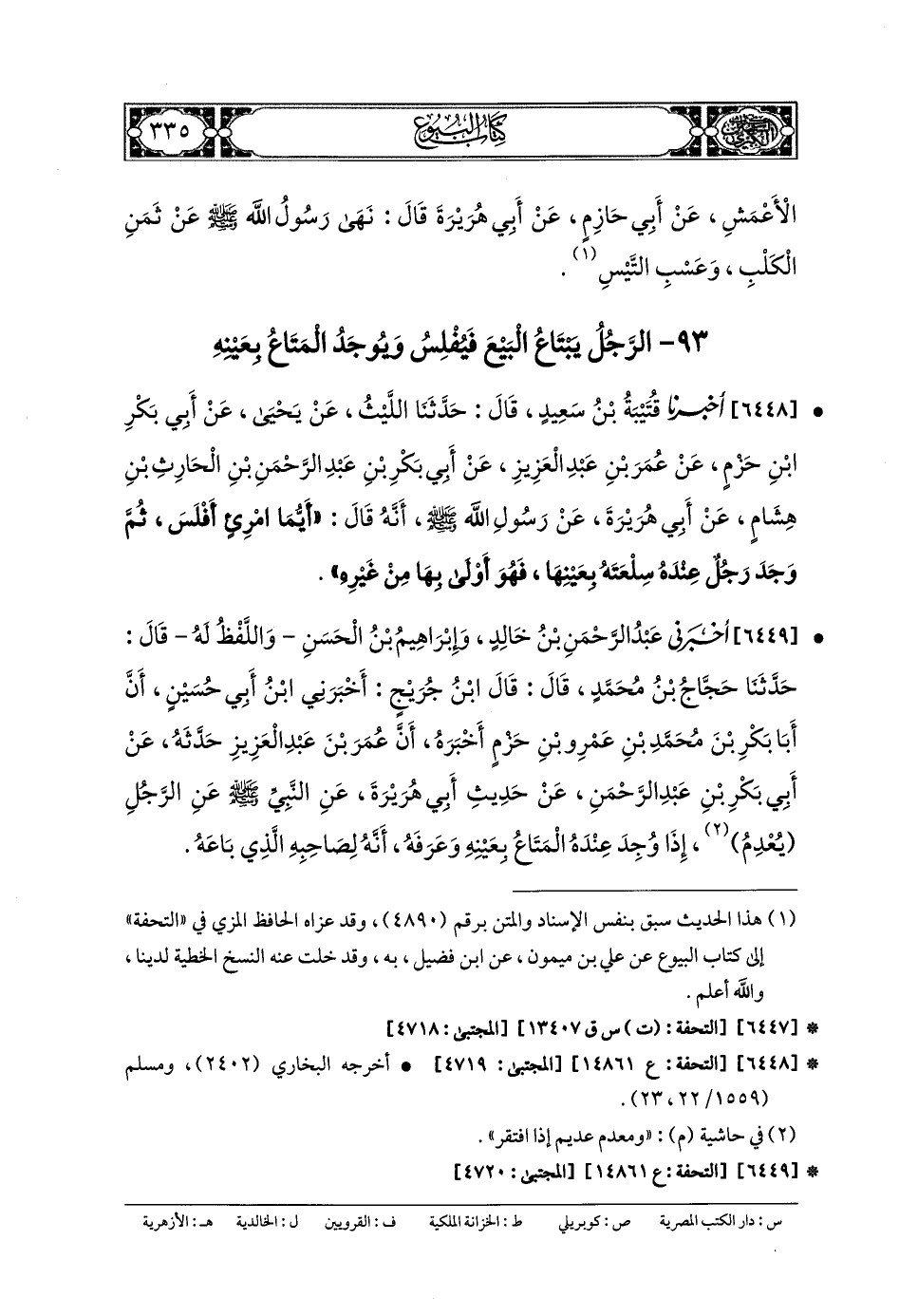 6448- أَخبَرنا قُتَيبَةُ بنُ سَعِيدٍ، قَالَ: حَدثنا اللَّيْثُ، عَن يَحيَى، عَن أَبي بَكْرِ بنِ حَزْمٍ، عَن عُمَرَ بنِ عَبدِ العَزِيزِ، عَن أَبي بَكْرِ بنِ عَبدِ الرَّحمَنِ بنِ الحَارِثِ بنِ هِشَامٍ، عَن أَبي هُرَيرَةَ، عَن رَسُولِ اللهِ صَلى الله عَليه وسَلم، أَنَّهُ قَالَ: أَيُّمَا امْرِئٍ أَفْلَسَ، ثُمَّ وَجَدَ رَجُلٌ عِنْدَهُ سِلْعَتَهُ بِعَيْنِهَا فَهُوَ أَوْلَى بِهَا مِنْ غَيْرِهِ.