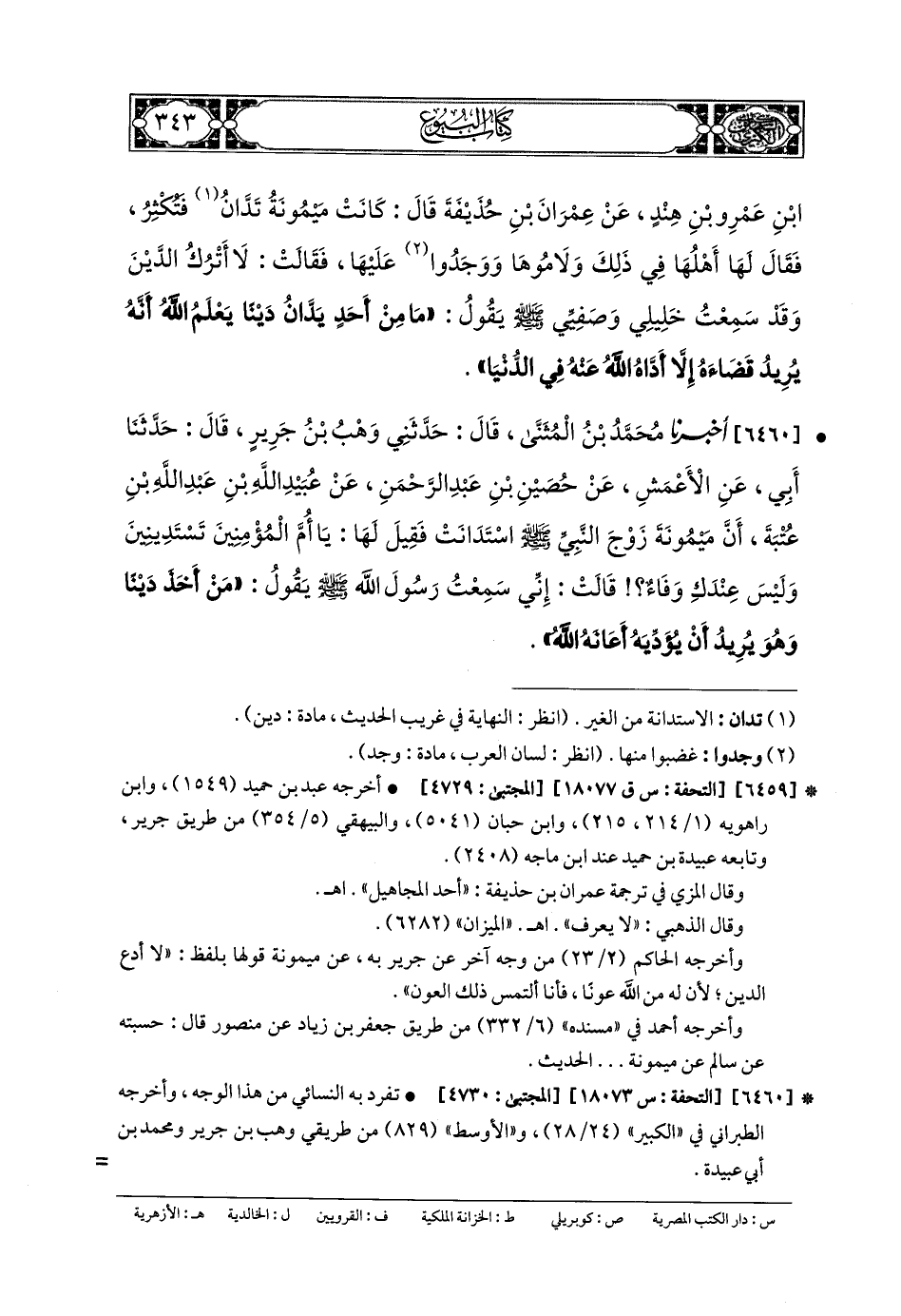 6460- أَخبَرنا مُحَمدُ بنُ المُثَنَّى، قَالَ: حَدثنا وَهْبُ بنُ جَرِيرٍ، قَالَ: حَدثنا أَبي، عَنِ الأَعْمَشِ، عَن حُصَيْنِ بنِ عَبدِ الرَّحمَنِ، عَن عُبَيدِ اللهِ بنِ عَبدِ اللهِ بنِ عُتْبَةَ، أَنَّ مَيْمُونَةَ زَوْجَ النَّبيِّ صَلى الله عَليه وسَلم اسْتَدَانَتْ، فَقِيلَ لَهَا: يَا أُمَّ المُؤْمِنِينَ، تَسْتَدِينِينَ وَلَيْسَ عِنْدَكِ وَفَاءٌ؟ قَالَتْ: إِنِّي سَمِعْتُ رَسُولَ اللهِ صَلى الله عَليه وسَلم يَقُولُ: مَنْ أَخَذَ دَيْنًا وَهُوَ يُرِيدُ أَنْ يُؤَدِّيَهُ أَعَانَهُ اللهُ.