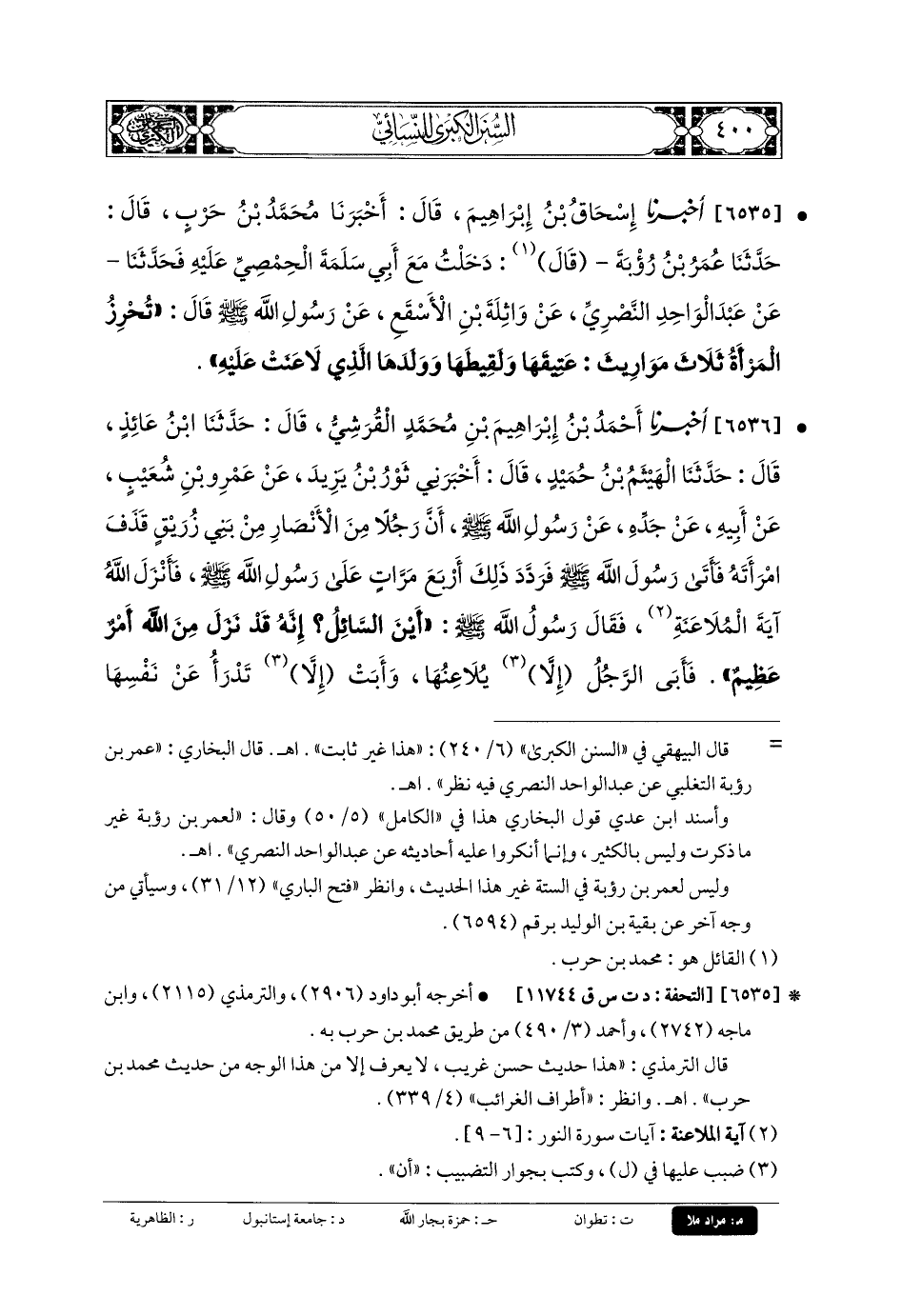 6535- أَخبَرنا إِسحَاقُ بنُ إِبرَاهِيمَ، قَالَ: أَخبَرنا مُحَمدُ بنُ حَرْبٍ، قَالَ: حَدثنا عُمَرُ بنُ رُؤْبَةَ، قَالَ: دَخَلْتُ مَعَ أَبي سَلَمَةَ الحِمْصِيِّ عَلَيْهِ فَحَدثنا عَن عَبدِ الوَاحِدِ النَّصْرِيِّ، عَن وَاثِلَةَ بنِ الأَسْقَعِ، عَن رَسُولِ اللهِ صَلى الله عَليه وسَلم، قَالَ: تُحْرِزُ المَرْأَةُ ثَلاثَةَ مَوَارِيثَ: عَتِيقَهَا، وَلَقِيطَهَا، وَوَلَدَهَا الَّذِي لاعَنَتْ عَلَيْهِ.