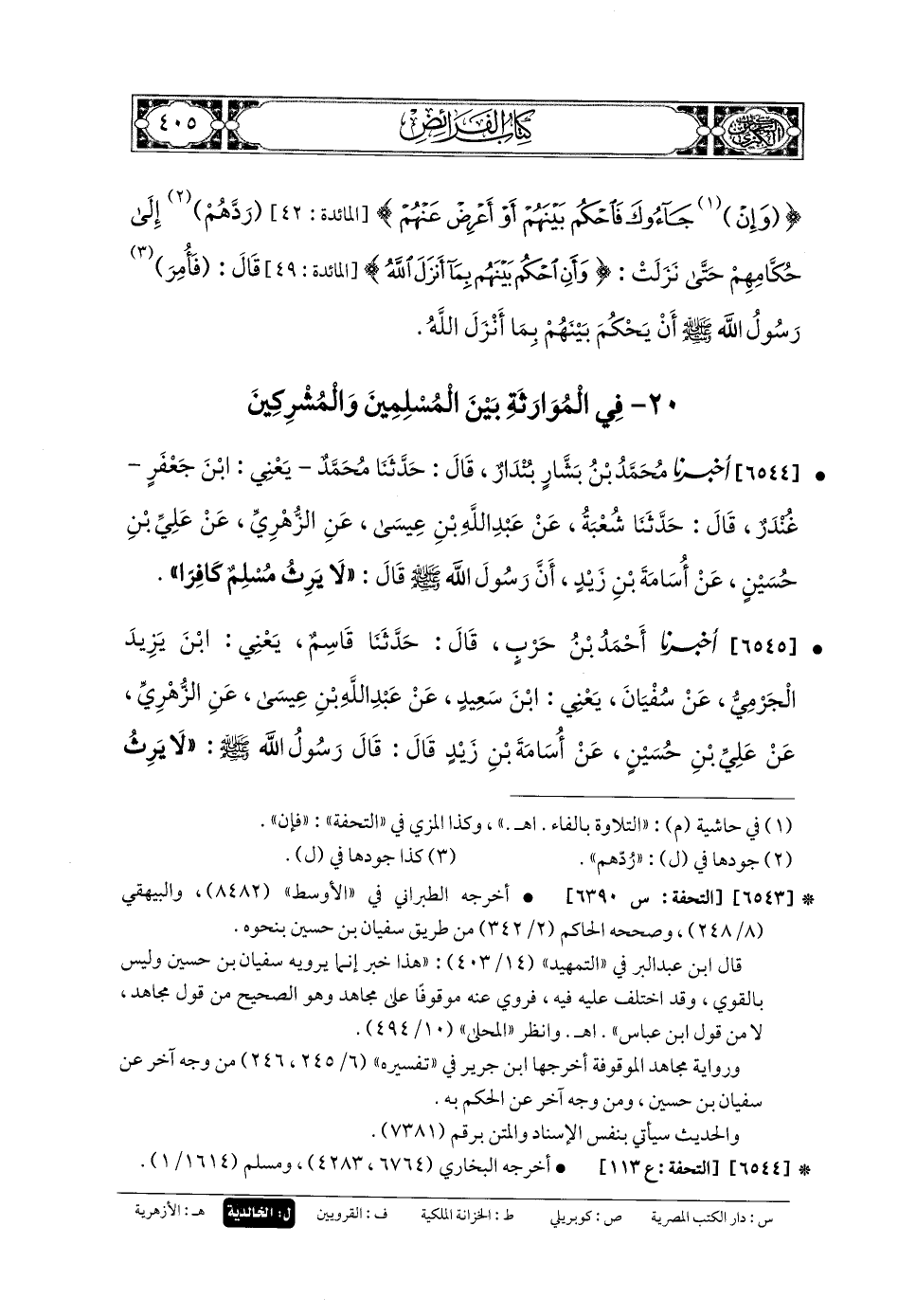 6545- أَخبَرنا أَحْمَدُ بنُ حَرْبٍ، قَالَ: حَدثنا قَاسِمٌ، يَعْنِي ابنَ يَزِيدَ الجَرْمِيَّ، عَن سُفيانَ، يَعْنِي ابنَ سَعِيدٍ، عَن عَبدِ اللهِ بنِ عِيسَى، عَنِ الزُّهْرِيِّ، عَن عَليِّ بنِ حُسَيْنٍ، عَن أُسَامَةَ بنِ زَيْدٍ، قَالَ: قَالَ رَسُولُ اللهِ صَلى الله عَليه وسَلم: لا يَرِثُ المُسْلِمُ الكَافِرَ، وَلا الكَافِرُ المُسْلِمَ.