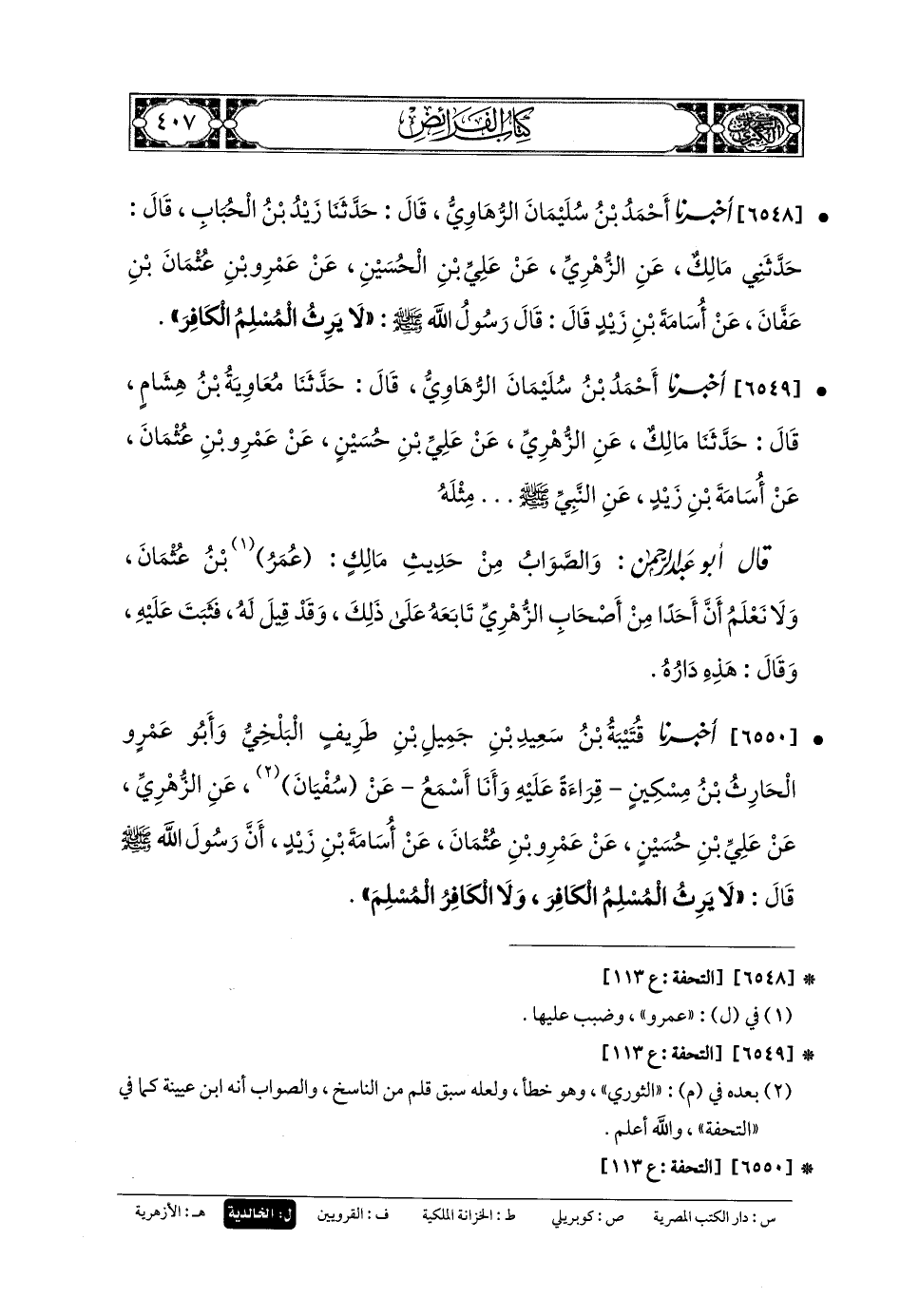 6550- أَخبَرنا قُتَيبَةُ بنُ سَعِيدِ بنِ جَمِيلِ بنِ طَرِيفٍ البَلْخِيُّ، وَأَبو عَمْرٍو الحَارِثُ بنُ مِسْكِينٍ، قِرَاءَةً عَلَيْهِ، وَأنا أَسْمَعُ، عَن سُفيانَ، عَنِ الزُّهْرِيِّ، عَن عَليِّ بنِ حُسَيْنٍ، عَن عَمْرِو بنِ عُثْمَانَ، عَن أُسَامَةَ بنِ زَيْدٍ، أَنَّ رَسُولَ اللهِ صَلى الله عَليه وسَلم قَالَ: لا يَرِثُ المُسْلِمُ الكَافِرَ، وَلا الكَافِرُ المُسْلِمَ.