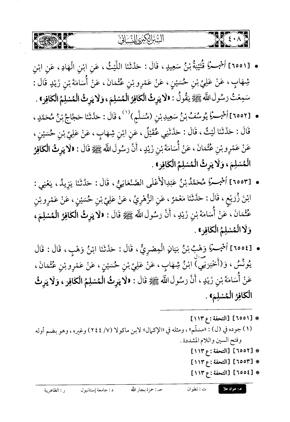 6552- أَخبَرنا يُوسُفُ بنُ سَعِيدِ بنِ مُسْلِمٍ، قَالَ: حَدثنا حَجَّاجُ بنُ مُحَمدٍ، قَالَ: حَدثنا لَّيْثُ، قَالَ: حَدَّثني عُقَيْلٌ، عَنِ ابنِ شِهَابٍ، عَن عَليِّ بنِ حُسَيْنٍ، عَن عَمْرِو بنِ عُثْمَانَ، عَن أُسَامَةَ بنِ زَيْدٍ، أَنَّ رَسُولَ اللهِ صَلى الله عَليه وسَلم قَالَ: لا يَرِثُ الكَافِرُ المُسْلِمَ، وَلا يَرِثُ المُسْلِمُ الكَافِرَ.