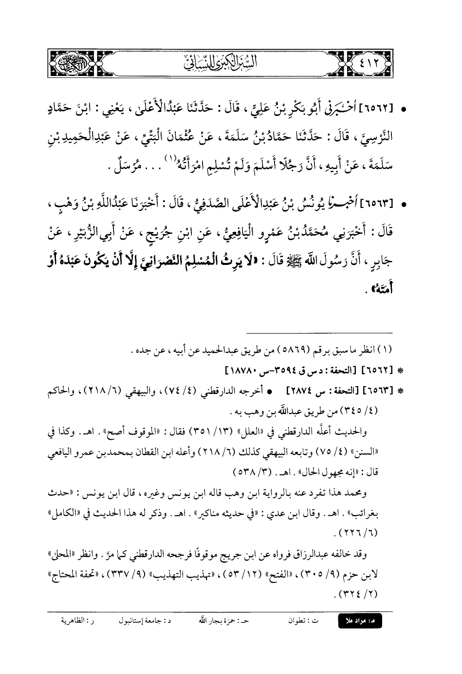6562- أَخبَرني أَبو بَكْرِ بنُ عَليٍّ، قَالَ: حَدثنا عَبدُ الأَعْلَى، يَعْنِي ابنَ حَمَّادٍ النَّرْسِيَّ، قَالَ: حَدثنا حَمَّادُ بنُ سَلَمَةَ، عَن عُثْمَانَ البَتِّيِّ، عَن عَبدِ الحَمِيدِ بنِ سَلَمَةَ، عَن أَبيهِ، أَنَّ رَجُلاً أَسْلَمَ، وَلَمْ تُسْلِمِ امْرَأَتُهُ ... مُرْسَلٌ.