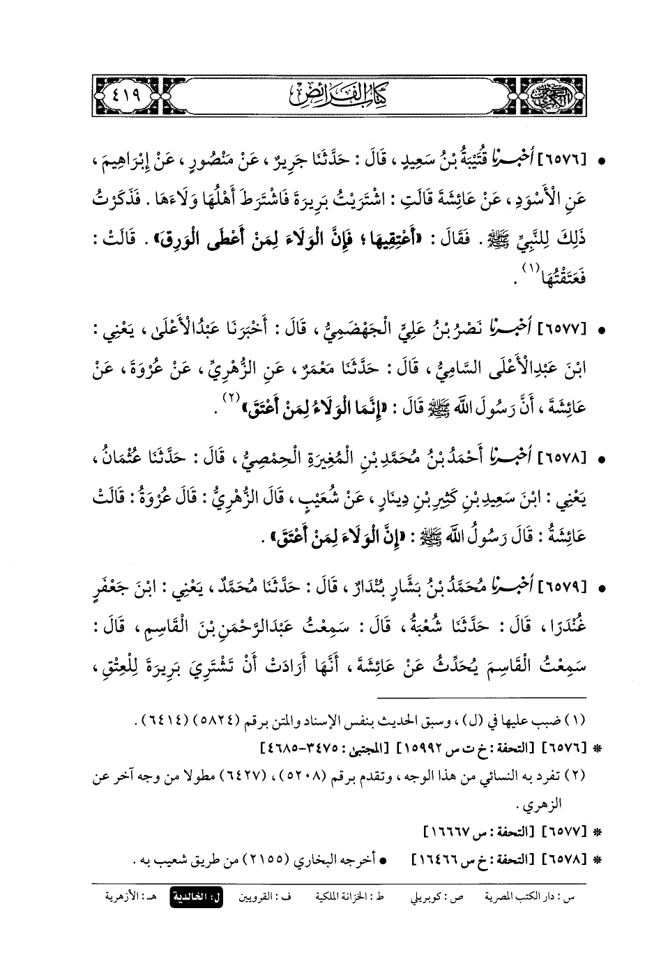 6576- أَخبَرنا قُتَيبَةُ بنُ سَعِيدٍ، قَالَ: حَدثنا جَرِيرٌ، عَن مَنصُورٍ، عَن إِبرَاهِيمَ، عَنِ الأَسْوَدِ، عَن عَائِشَةَ، قَالَتْ: اشْتَرَيْتُ بَرِيرَةَ، فَاشْتَرَطَ أَهْلُهَا وَلاءَهَا، فَذَكَرْتُ ذَلِكَ لِلنَّبِيِّ صَلى الله عَليه وسَلم، فَقَالَ: أَعْتِقِيهَا، فَإِنَّ الوَلاءَ لِمَنْ أَعْطَى الوَرِقَ، قَالَتْ: فَعَتَقْتُهَا.