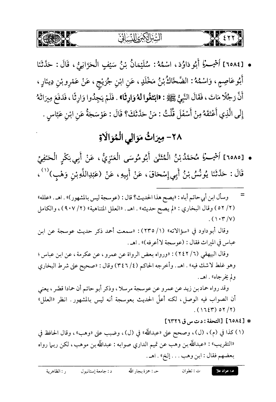 6584- أَخبَرنا أَبو دَاوُدَ، اسْمُهُ: سُلَيمَانُ بنُ سَيْفٍ الحَرَّانِيُّ، قَالَ: حَدثنا أَبو عَاصِمٍ، وَاسْمُهُ: الضَّحَّاكُ بنُ مَخْلَدٍ، عَنِ ابنِ جُرَيْجٍ، عَن عَمْرِو بنِ دِينَارٍ، أَنَّ رَجُلاً مَاتَ، فَقَالَ النَّبيُّ صَلى الله عَليه وسَلم: ابْتَغُوا لَهُ وَارِثًا، فَلَمْ يَجِدُوا وَارِثًا، فَدَفَعَ مِيرَاثَهُ إِلَى الَّذِي أَعْتَقَهُ مِنْ أَسْفَلِ، قُلْتُ: مَنْ حَدَّثَكَ؟ قَالَ: عَوْسَجَةُ، عَنِ ابنِ عَبَّاسٍ.