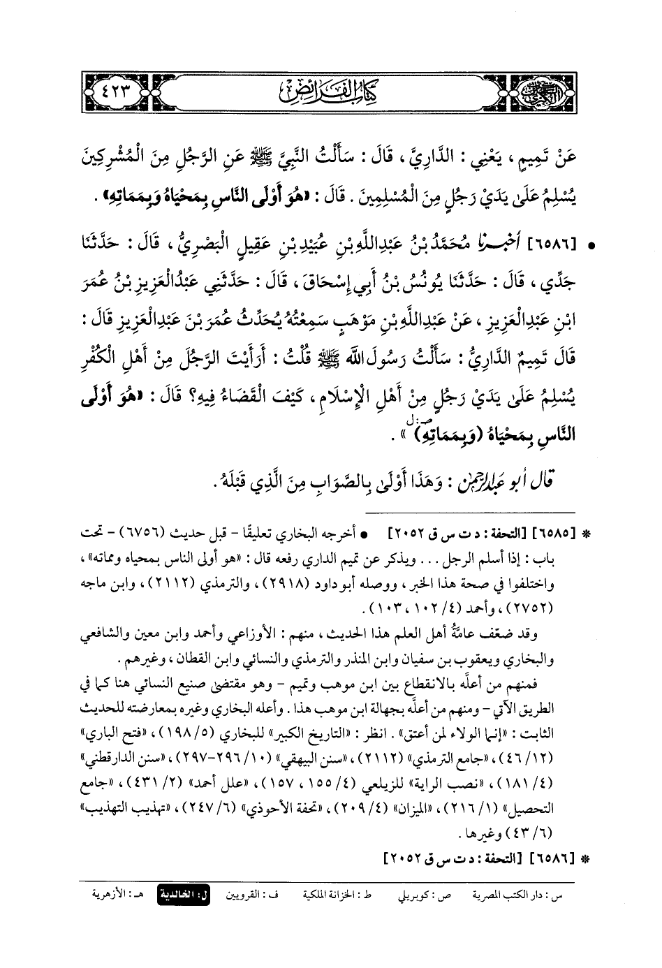 6586- أَخبَرنا مُحَمدُ بنُ عَبدِ اللهِ بنِ عُبَيدِ بنِ عَقِيلٍ البَصْرِيُّ، قَالَ: حَدثنا جَدِّي، قَالَ: حَدثنا يُونُسُ بنُ أَبي إِسحَاقَ، قَالَ: حَدَّثني عَبدُ العَزِيزِ بنُ عُمَرَ بنِ عَبدِ العَزِيزِ، عَن عَبدِ اللهِ بنِ مَوْهَبٍ، سَمِعْتُهُ يُحَدِّثُ عُمَرَ بْنَ عَبدِ العَزِيزِ، قَالَ: قَالَ تَمِيمٌ الدَّارِيُّ: سَأَلْتُ رَسُولَ اللهِ صَلى الله عَليه وسَلم، قُلْتُ: أَرَأَيْتَ الرَّجُلَ مِنْ أَهْلِ الكُفْرِ يُسْلِمُ عَلَى يَدَيْ رَجُلٍ مِنْ أَهْلِ الإِسلامِ، كَيْفَ القَضَاءُ فِيهِ؟ قَالَ: هُوَ أَوْلَى النَّاسِ بِمَحْيَاهُ وَبِمَمَاتِهِ.