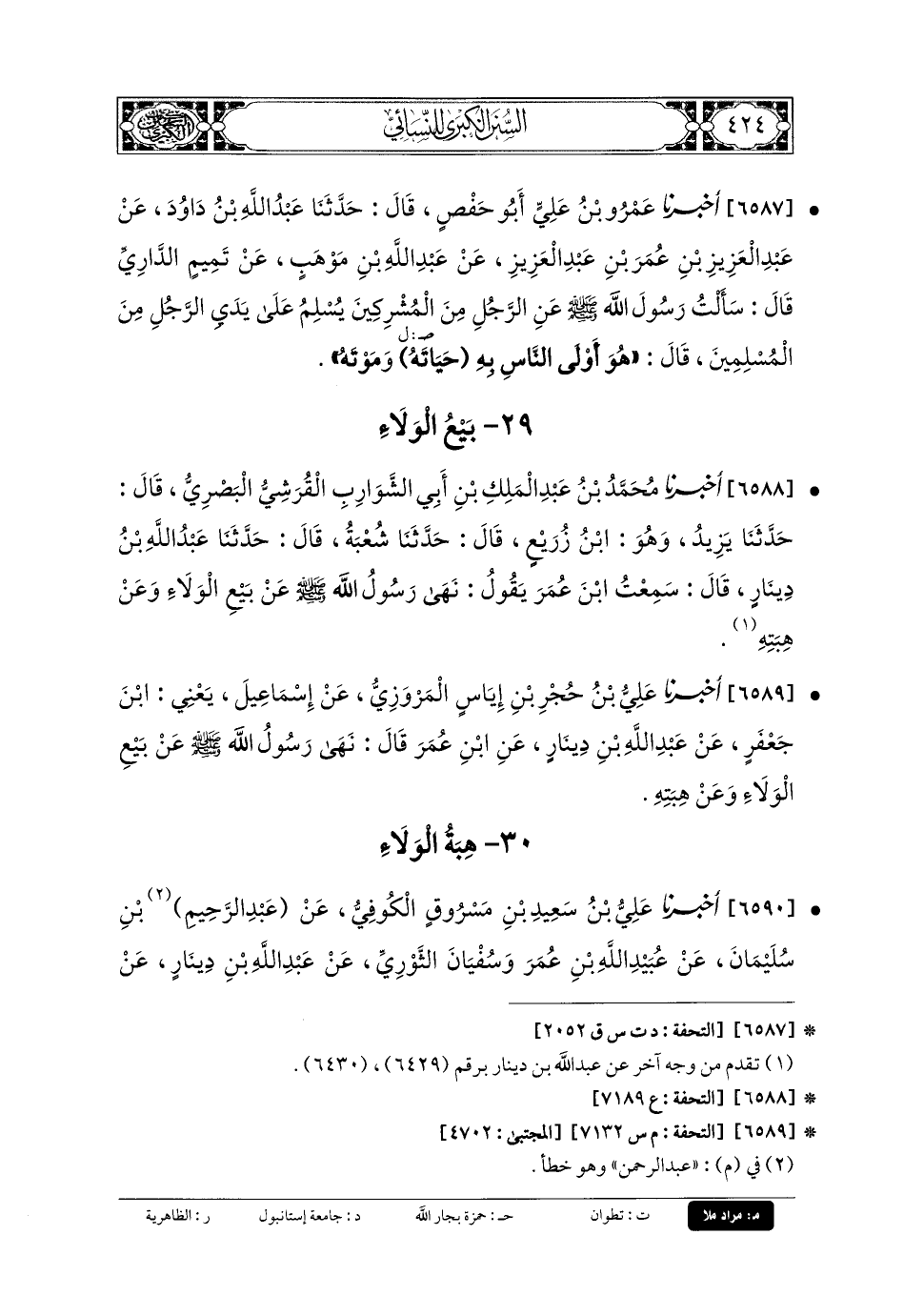 6589- أَخبَرنا عَليُّ بنُ حُجْرِ بنِ إِيَاسٍ المَرْوَزِيُّ، عَن إِسمَاعِيلَ، يَعْنِي ابنَ جَعفَرٍ، عَن عَبدِ اللهِ بنِ دِينَارٍ، عَنِ ابنِ عُمَرَ، قَالَ: نَهَى رَسُولُ اللهِ صَلى الله عَليه وسَلم عَن بَيْعِ الوَلاءِ، وَعَن هِبَتِهِ.