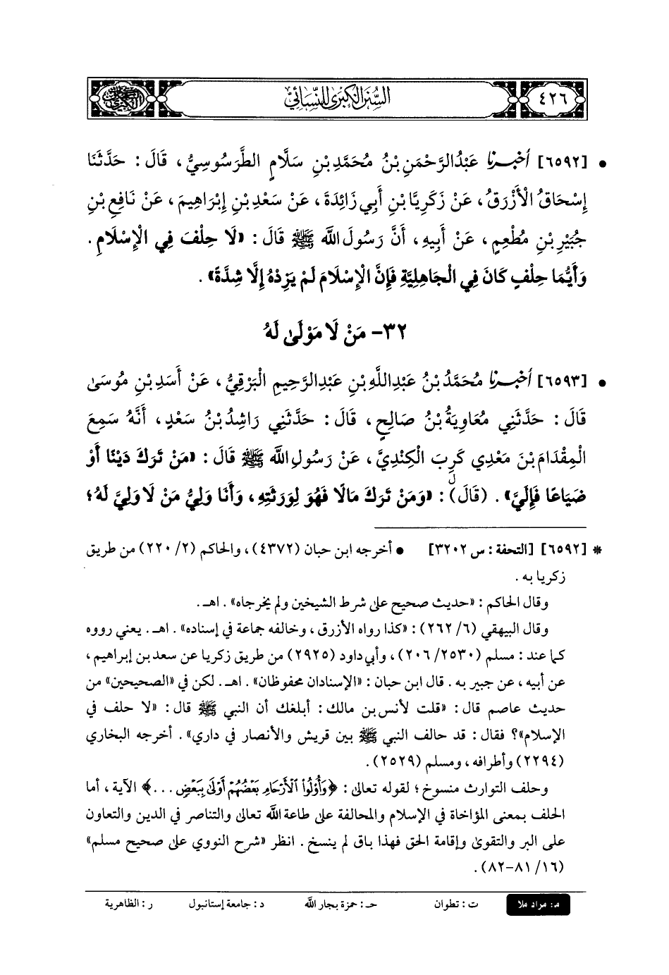 6592- أَخبَرنا عَبدُ الرَّحمَنِ بنُ مُحَمدِ بنِ سَلاَّمٍ الطَّرَسُوسِيُّ، قَالَ: حَدثنا إِسحَاقُ الأَزْرَقُ، عَن زَكَرِيَّا بنِ أَبي زَائِدَةَ، عَن سَعْدِ بنِ إِبرَاهِيمَ، عَن نَافِعِ بنِ جُبَيْرِ بنِ مُطْعِمٍ، عَن أَبيهِ، أَنَّ رَسُولَ اللهِ صَلى الله عَليه وسَلم قَالَ: لا حِلْفَ فِي الإِسلامِ، وَأَيُّمَا حِلْفٍ كَانَ فِي الجَاهِلِيَّةِ، فَإِنَّ الإِسلامَ لَمْ يَزِدْهُ إِلاَّ شِدَّةً.