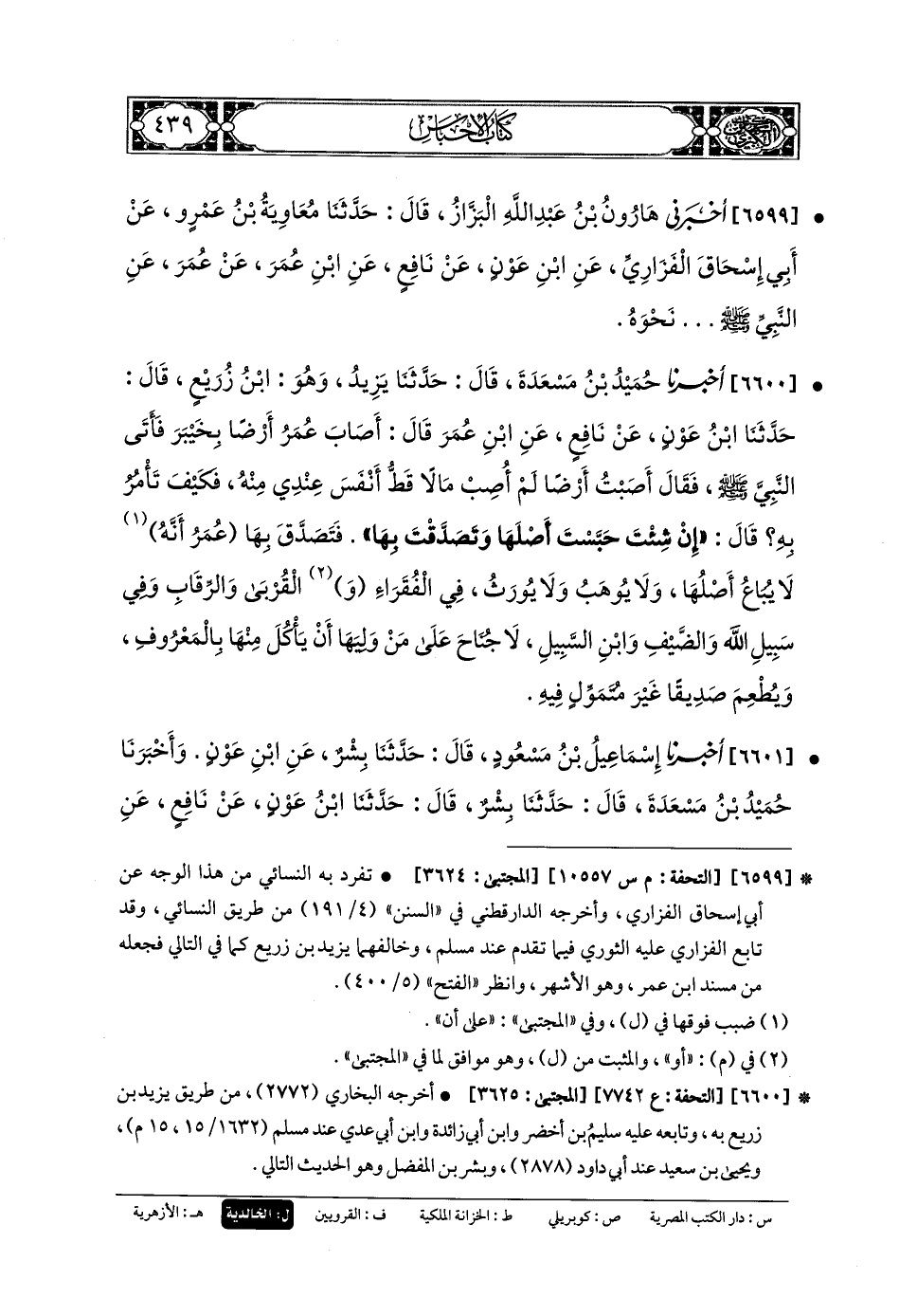 6601- أَخبَرنا إِسمَاعِيلُ بنُ مَسْعُودٍ، قَالَ: حَدثنا بِشْرٌ، عَنِ ابنِ عَوْنٍ وَأَخبَرنا حُمَيْدُ بنُ مَسْعَدَةَ، قَالَ: حَدثنا بِشْرٌ، قَالَ: حَدثنا ابنُ عَوْنٍ، عَن نَافِعٍ، عَنِ ابنِ عُمَرَ، قَالَ: أَصَابَ عُمَرُ أَرْضًا بِخَيْبَرَ، فَأَتَى النَّبيَّ صَلى الله عَليه وسَلم، فَاسْتَأْمَرَهُ فِيهَا، فَقَالَ: إِنِّي أَصَبْتُ أَرْضًا بِخَيْبَرَ، لَمْ أُصِبْ مَالاً قَطُّ أَنْفَسَ عِنْدِي مِنْهُ، فَمَا تَأْمُرُ فِيهَا؟ قَالَ: إِنْ شِئْتَ حَبَّسْتَ أَصْلَهَا، وَتَصَدَّقْتَ بِهَا، فَتَصَدَّقَ بِهَا، عَلَى أَنَّهُ لا يُبَاعُ أَصْلُهَا، وَلا يُوهَبُ، وَلا يُورَثُ، فَتَصَدَّقَ بِهَا فِي الفُقَرَاءِ، والقُرْبَى، وَفِي الرِّقَابِ، وَفِي سَبِيلِ اللهِ، وَابْنِ السَّبِيلِ، وَالضَّيْفِ، لا جُنَاحَ، ثُمَّ انْقَطَعَ عَلَى أَبي مُعاويَةَ، أَوْ يُطْعِمَ صَدِيقًا غَيْرَ مُتَمَوِّلٍ.