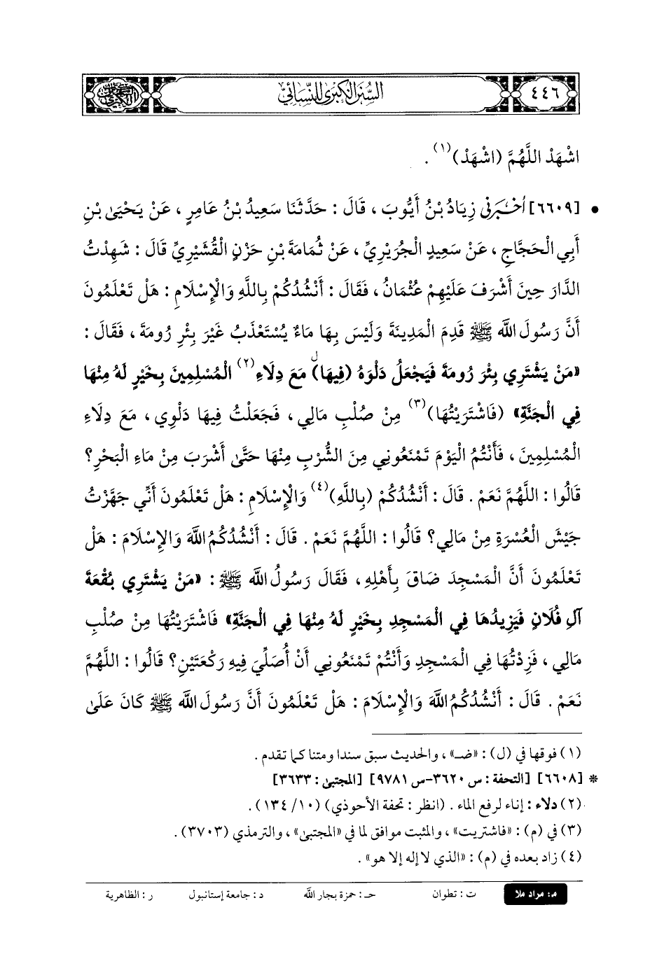 6609- أَخبَرني زِيَادُ بنُ أَيوبَ، قَالَ: حَدثنا سَعِيدُ بنُ عَامِرٍ، عَن يَحيَى بنِ أَبي الحَجَّاجِ، عَن سَعِيدٍ الجُرَيْرِيِّ، عَن ثُمَامَةَ بنِ حَزْنٍ القُشَيْرِيِّ، قَالَ: شَهِدْتُ الدَّارَ حِينَ أَشْرَفَ عَلَيْهِمْ عُثْمَانُ، فَقَالَ: أَنْشُدُكُمْ بِاللهِ وَالإِسلامَ، هَلْ تَعْلَمُونَ أَنَّ رَسُولَ اللهِ صَلى الله عَليه وسَلم قَدِمَ المَدِينَةَ، وَلَيْسَ بِهَا مَاءٌ يُسْتَعْذَبُ غَيْرَ بِئْرِ رُومَةَ، فَقَالَ: مَنْ يَشْتَرِي بِئْرَ رُومَةَ، فَيَجْعَلُ دَلْوَهُ فِيهَا مَعَ دِلاءِ المُسْلِمِينَ بِخَيْرٍ لَهُ مِنْهَا فِي الجَنَّةِ، فَاشْتَرَيْتُها مِنْ صُلْبِ مَالِي، فَجَعَلْتُ فِيهَا دَلْوِي مَعَ دِلاءِ المُسْلِمِينَ، فَأَنْتُمُ اليَوْمَ تَمْنَعُونِي مِنَ الشُّرْبِ مِنْهَا حَتَّى أَشْرَبَ مِنْ مَاءِ البَحْرِ؟ قَالُوا: اللهُمَّ نَعَمْ، قَالَ: أَنْشُدُكُمْ بِاللهِ الَّذِي لا إِلَهَ إِلاَّ هُوَ وَالإِسلامَ، هَلْ تَعْلَمُونَ أَنِّي جَهَّزْتُ جَيْشَ العُسْرَةِ مِنْ مَالِي؟ قَالُوا: اللهُمَّ نَعَمْ، قَالَ: أَنْشُدُكُمُ اللهِ وَالإِسلامَ، هَلْ تَعْلَمُونَ أَنَّ المَسْجِدَ ضَاقَ بِأَهْلِهِ، فَقَالَ رَسُولُ اللهِ صَلى الله عَليه وسَلم: مَنْ يَشْتَرِي بُقْعَةَ آلِ فُلانٍ، فَيَزِيدُهَا فِي المَسْجِدِ بِخَيْرٍ لَهُ مِنْهَا فِي الجَنَّةِ، فَاشْتَرَيْتُهَا مِنْ صُلْبِ مَالِي، فَزِدْتُهَا فِي المَسْجِدِ، وَأَنْتُمْ تَمْنَعُونِي أَنْ أُصَلِّيَ فِيهِ رَكْعَتَيْنِ؟ قَالُوا: اللهُمَّ نَعَمْ، قَالَ: أَنْشُدُكُمُ اللهَ وَالإِسلامَ، هَلْ تَعْلَمُونَ أَنَّ رَسُولَ اللهِ صَلى الله عَليه وسَلم كَانَ عَلَى ثَبِيرٍ؛ ثَبِيرِ مَكَّةَ، وَمَعَهُ أَبو بَكْرٍ، وَعُمَرُ، وَأَنَا، فَتَحَرَّكَ الجَبَلُ، فَرَكَضَهُ رَسُولُ اللهِ صَلى الله عَليه وسَلم بِرِجْلِهِ، وَقَالَ: اسْكُنْ ثَبِيرُ، فَإِنَّمَا عَلَيْكَ نَبِيٌّ، وَصِدِّيقٌ، وَشَهِيدَانِ، قَالُوا: اللهُمَّ نَعَمْ، قَالَ: اللهُ أَكْبَرُ، شَهِدُوا لِي وَرَبِّ الكَعْبَةِ، : أَنِّي يَعْنِي شَهِيدا.