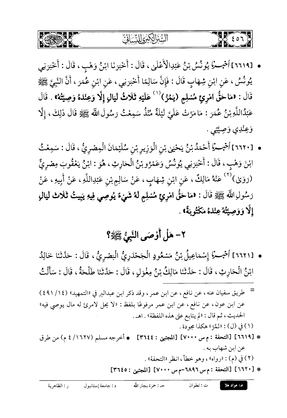 6620- أَخبَرنا أَحْمَدُ بنُ يَحيَى بنِ الوَزِيرِ بنِ سُلَيمَانَ المِصْرِيُّ، قَالَ: سَمِعْتُ ابنَ وَهْبٍ، قَالَ: أَخبَرني يُونُسُ، وَعَمْرُو بنُ الحَارِثِ، هُوَ ابنُ يَعْقُوبَ، مِصْرِيٌّ، رَوَى عَنهُ مَالِكٌ، عَنِ ابنِ شِهَابٍ، عَن سَالِمِ بنِ عَبدِ اللهِ، عَن أَبيهِ، عَن رَسُولِ اللهِ صَلى الله عَليه وسَلم، قَالَ: مَا حَقُّ امْرِئٍ مُسْلِمٍ، لَهُ شَيْءٌ يُوصَى فِيهِ، يَبِيتُ ثَلاثَ لَيَالٍ إِلاَّ وَوَصِيَّتُهُ عِنْدَهُ مَكْتُوبَةٌ.
