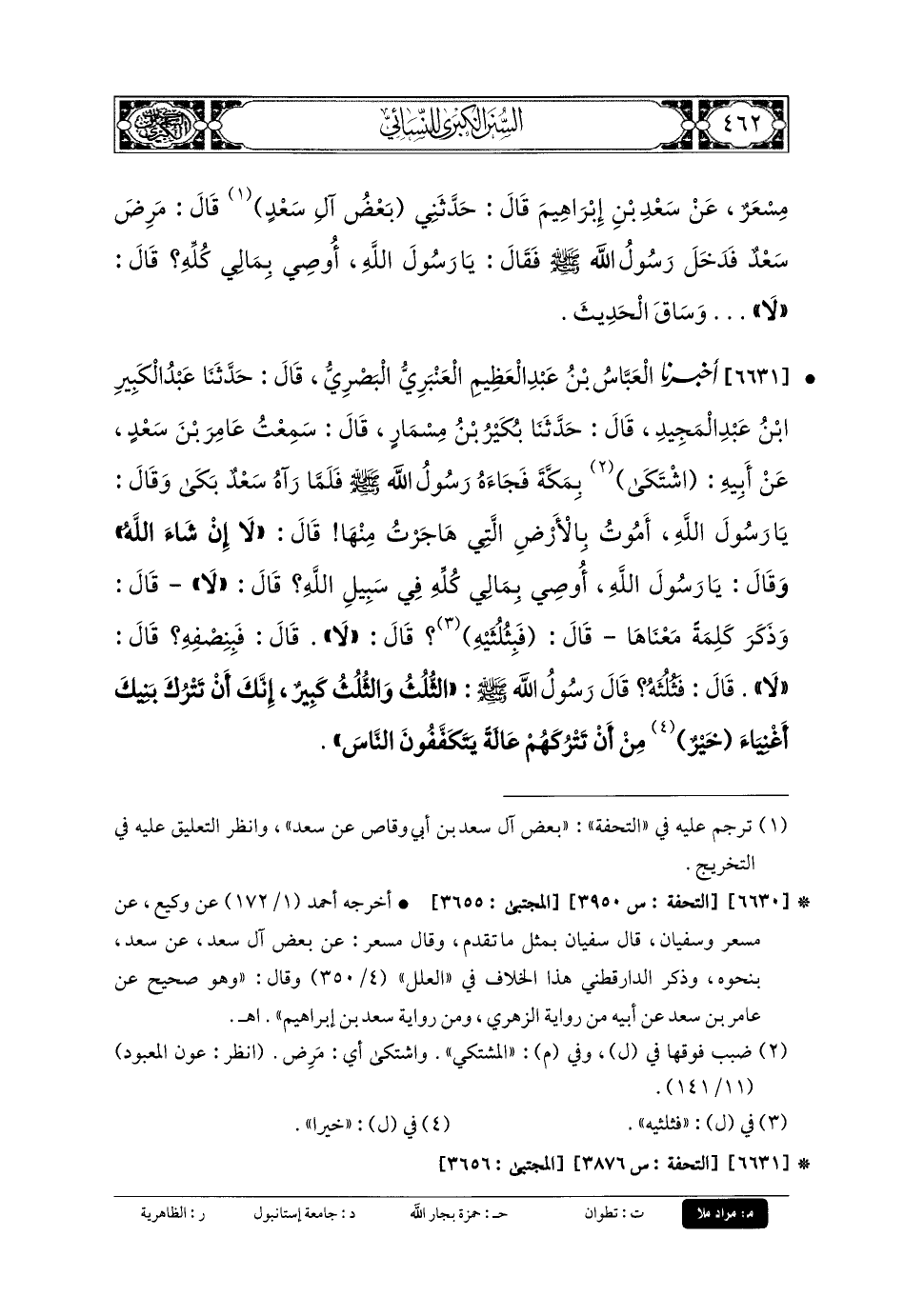 6631- أَخبَرنا العَبَّاسُ بنُ عَبدِ العَظِيمِ العَنبَرِيُّ البَصْرِيُّ، قَالَ: حَدثنا عَبدُ الكَبِيرِ بنُ عَبدِ المَجِيدِ، قَالَ: حَدثنا بُكَيْرُ بنُ مِسْمَارٍ، قَالَ: سَمِعْتُ عَامِرَ بْنَ سَعْدٍ، عَن أَبيهِ، أَنَّهُ اشْتَكَى بِمَكَّةَ، فَجَاءَهُ رَسُولُ اللهِ صَلى الله عَليه وسَلم، فَلَمَّا رَآهُ سَعْدٌ بَكَى، وَقَالَ: يَا رَسُولَ اللهِ، أَمُوتُ بِالأَرْضِ الَّتِي هَاجَرْتُ مِنْهَا، قَالَ: لا، إِنْ شَاءَ اللهُ، وَقَالَ: يَا رَسُولَ اللهِ، أُوصِي بِمَالِي كُلِّهِ فِي سَبِيلِ اللهِ؟ قَالَ: لا، قَالَ: وَذَكَرَ كلمةً مَعْنَاهَا، قَالَ: فَبِثُلُثَيْهِ؟ قَالَ: لا، قَالَ: فَبِنِصْفِهِ؟ قَالَ: لا، قَالَ: فَثُلُثَهُ؟ قَالَ رَسُولُ اللهِ صَلى الله عَليه وسَلم: الثُّلُثَ، والثُّلُثُ كَبِيرٌ، إِنَّكَ أَنْ تَتْرُكَ بَنِيكَ أَغْنِيَاءَ، خَيْرٌ مِنْ أَنْ تَتْرُكَهُمْ عَالَةً يَتَكَفَّفُونَ النَّاسَ.