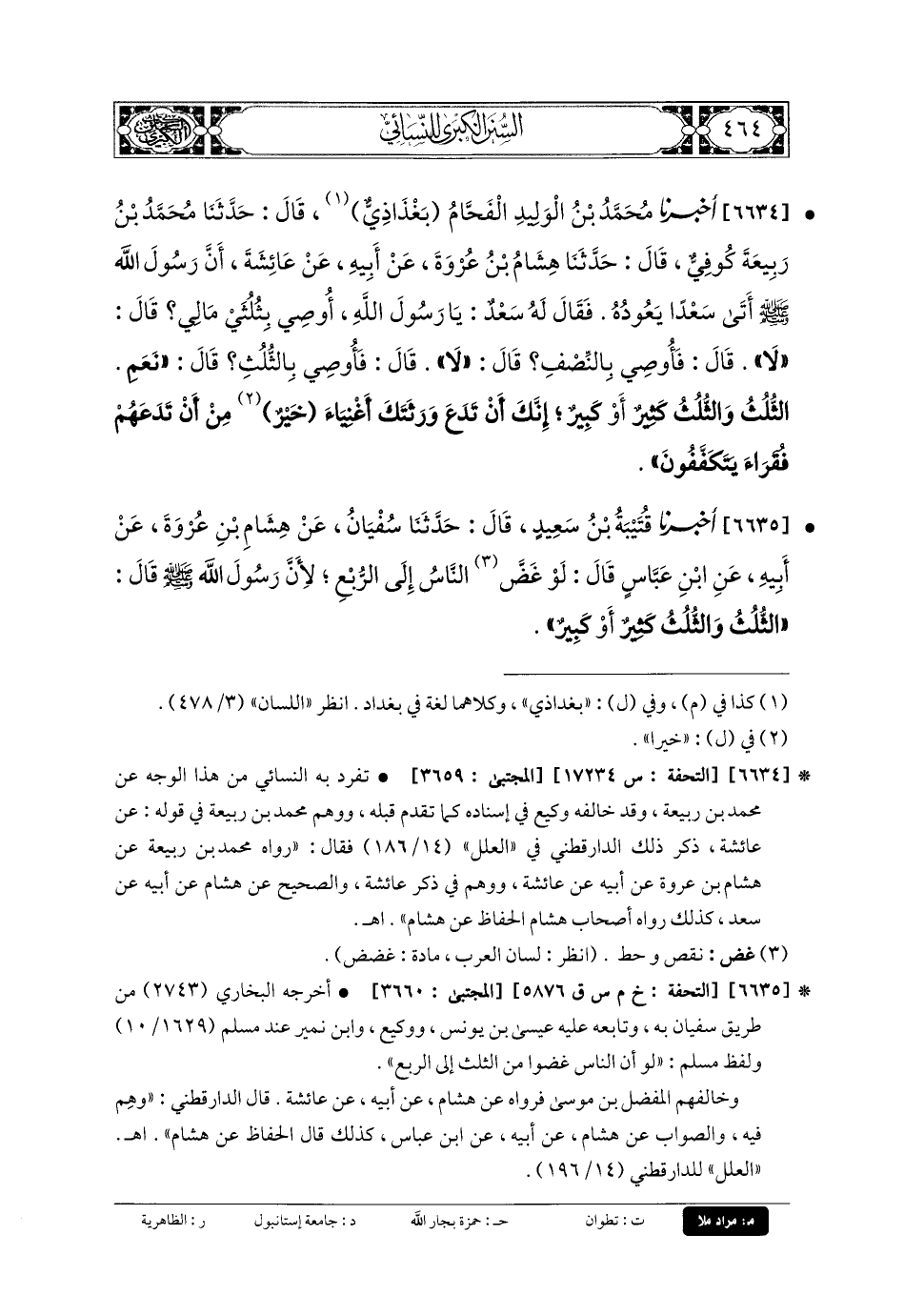 6634- أَخبَرنا مُحَمدُ بنُ الوَلِيدِ الفَحَّامُ، بَغْدَادِيٌّ، قَالَ: حَدثنا مُحَمدُ بنُ رَبِيعَةَ، كُوفِيٌّ، قَالَ: حَدثنا هِشَامُ بنُ عُرْوَةَ، عَن أَبيهِ، عَن عَائِشَةَ، أَنَّ رَسُولَ اللهِ صَلى الله عَليه وسَلم أَتَى سَعْدًا يَعُودُهُ، فَقَالَ لَهُ سَعْدٌ: يَا رَسُولَ اللهِ، أُوصِي بِثُلُثَيْ مَالِي؟ قَالَ: لا، قَالَ: فَأُوصِي بِالنِّصْفِ؟ قَالَ: لا، قَالَ: فَأُوصِي بِالثُّلُثِ؟ قَالَ: نَعَمْ، الثُّلُثَ، وَالثُّلُثُ كَثِيرٌ، أَوْ كَبِيرٌ، إِنَّكَ أَنْ تَدَعَ وَرَثَتَكَ أَغْنِيَاءَ، خَيْرٌ مِنْ أَنْ تَدَعَهُمْ فُقَرَاءَ يَتَكَفَّفُونَ.