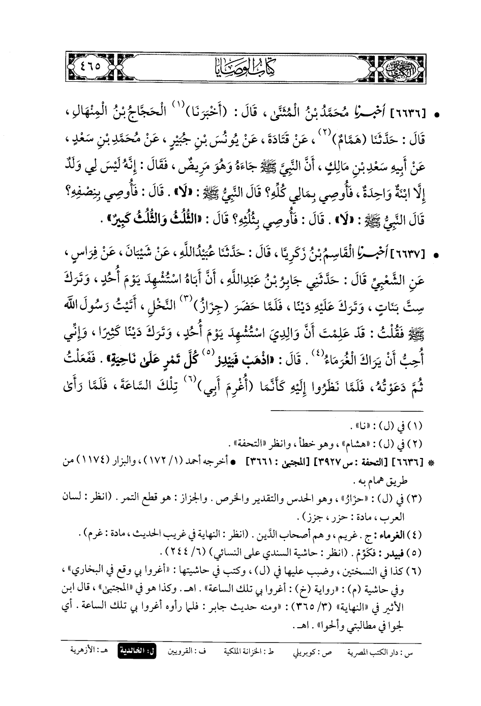 6636- أَخبَرنا مُحَمدُ بنُ المُثَنَّى، قَالَ: أَخبَرنا الحَجَّاجُ بنُ المِنْهَالِ، قَالَ: حَدثنا هَمَّامٌ، عَن قَتَادَةَ، عَن يُونُسَ بنِ جُبَيْرٍ، عَن مُحَمدِ بنِ سَعْدٍ، عَن أَبيهِ سَعْدِ بنِ مَالِكٍ، أَنَّ النَّبيَّ صَلى الله عَليه وسَلم جَاءَهُ وَهُوَ مَرِيضٌ، فَقَالَ: إِنَّهُ لَيْسَ لِي وَلَدٌ إِلاَّ ابنَةٌ وَاحِدَةٌ، فَأُوصِي بِمَالِي كُلِّهِ؟ قَالَ النَّبيُّ صَلى الله عَليه وسَلم: لا، قَالَ: فَأُوصِي بِنِصْفِهِ؟ قَالَ النَّبيُّ صَلى الله عَليه وسَلم: لا، قَالَ: فَأُوصِي بِثُلُثِهِ؟ قَالَ: الثُّلُثَ، وَالثُّلُثُ كَبِيرٌ.