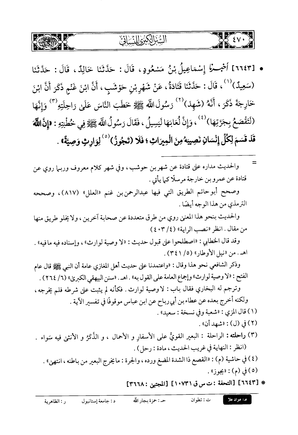 6643- أَخبَرنا إِسمَاعِيلُ بنُ مَسْعُودٍ، قَالَ: حَدثنا خَالِدٌ، قَالَ: حَدثنا سَعِيدٌ، قَالَ: حَدثنا قَتَادَةُ، عَن شَهْرِ بنِ حَوْشَبٍ، أَنَّ ابنَ غَنْمٍ ذَكَرَ، أَنَّ ابنَ خَارِجَةَ ذَكَرَ، أَنَّهُ شَهِدَ رَسُولَ اللهِ صَلى الله عَليه وسَلم خَطَبَ النَّاسَ عَلَى رَاحِلَتِهِ، وَإِنَّهَا لَتَقْصَعُ بِجَرَّتِهَا، وَإِنَّ لُعَابَهَا لَيَسِيلُ، فَقَالَ رَسُولُ اللهِ صَلى الله عَليه وسَلم فِي خُطْبَتِهِ: إِنَّ اللهَ قَدْ قَسَمَ لِكُلِّ إِنْسَانٍ نَصِيبَهُ مِنَ المِيرَاثِ، فَلا تجُوزُ لِوَارِثٍ وَصِيَّةٌ.