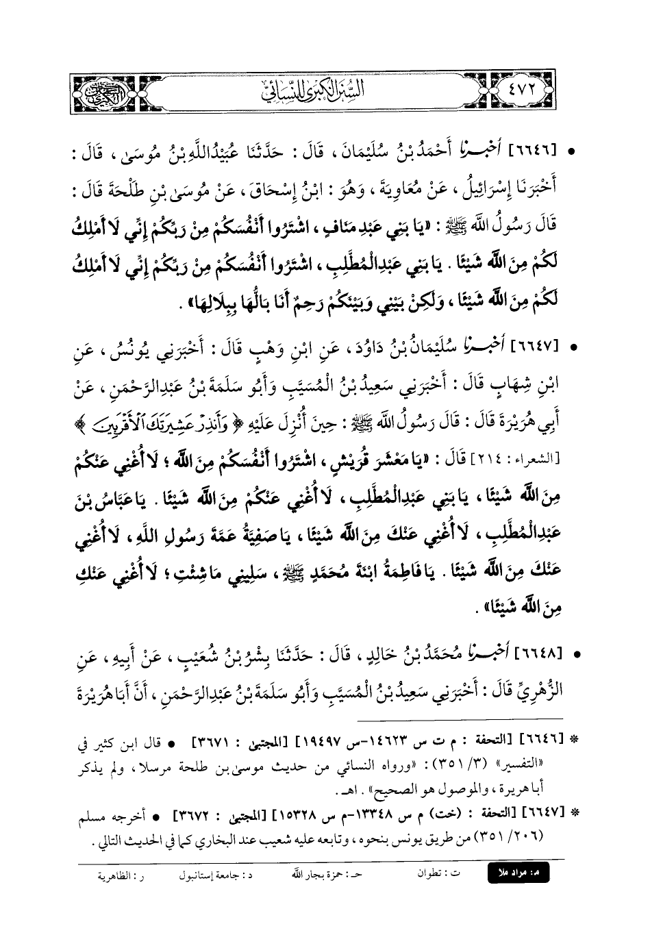 6646- أَخبَرنا أَحْمَدُ بنُ سُلَيمَانَ، قَالَ: حَدثنا عُبَيدُ اللهِ بنُ مُوسَى، قَالَ: أَخبَرنا إِسرَائِيلُ، عَن مُعاويَةَ، وَهُوَ ابنُ إِسحَاقَ، عَن مُوسَى بنِ طَلحَةَ، قَالَ: قَالَ رَسُولُ اللهِ صَلى الله عَليه وسَلم: يَا بَنِي عَبدِ مَنَافٍ، اشْتَرُوا أَنْفُسَكُمْ مِنْ رَبِّكُمْ، إِنِّي لا أَمْلِكُ لَكُمْ مِنَ اللهِ شَيْئًا، يَا بَنِي عَبدِ المُطَّلِبِ، اشْتَرُوا أَنْفُسَكُمْ مِنْ رَبِّكُمْ، إِنِّي لا أَمْلِكُ لَكُمْ مِنَ اللهِ شَيْئًا، وَلَكِنْ بَيْنِي وَبَيْنَكُمْ رَحِمٌ أَنَا بَالُّهَا بِبِلالِهَا.