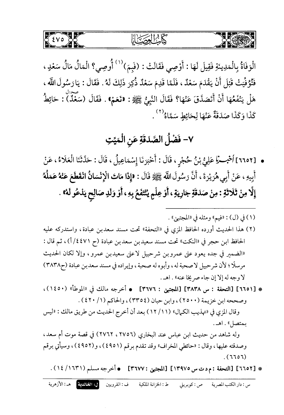 6652- أَخبَرنا عَليُّ بنُ حُجْرٍ، قَالَ: أَخبَرنا إِسمَاعِيلُ، قَالَ: حَدثنا العَلاءُ، عَن أَبيهِ، عَن أَبي هُرَيرَةَ، أَنَّ رَسُولَ اللهِ صَلى الله عَليه وسَلم قَالَ: إِذَا مَاتَ الإِنْسَانُ انْقَطَعَ عَنهُ عَمَلُهُ إِلاَّ مِنْ ثَلاثَةٍ: مِنْ صَدَقَةٍ جَارِيَةٍ، أَوْ عِلْمٍ يُنْتَفَعُ بِهِ، أَوْ وَلَدٍ صَالِحٍ يَدْعُو لَهُ.