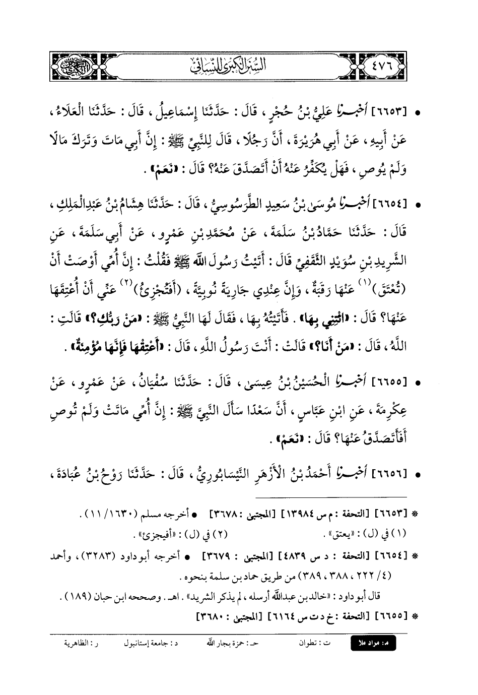 6654- أَخبَرنا مُوسَى بنُ سَعِيدٍ الطَّرْسُوسِيُّ، قَالَ: حَدثنا هِشَامُ بنُ عَبدِ المَلِكِ، قَالَ: حَدثنا حَمَّادُ بنُ سَلَمَةَ، عَن مُحَمدِ بنِ عَمْرٍو، عَن أَبي سَلَمَةَ، عَنِ الشَّرِيدِ بنِ سُوَيْدٍ الثَّقَفِيِّ، قَالَ: أَتَيْتُ رَسُولَ اللهِ صَلى الله عَليه وسَلم، فَقُلْتُ: إِنَّ أُمِّي أَوْصَتْ أَنْ تُعْتَقَ عَنهَا رَقَبَةٌ، وَإِنَّ عِنْدِي جَارِيَةً نُوبِيَّةً، أَفَتجْزِئُ عَنِّي أَنْ أُعْتِقَهَا عَنهَا؟ قَالَ: ائْتِنِي بِهَا، فَأَتَيْتُهُ بِهَا، فَقَالَ لَهَا النَّبيُّ صَلى الله عَليه وسَلم: مَنْ رَبُّكِ؟ قَالَتِ: اللهُ، قَالَ: مَنْ أَنَا؟ قَالَتْ: أَنْتَ رَسُولُ اللهِ، قَالَ: أَعْتِقْهَا، فَإِنَّهَا مُؤْمِنَةٌ.