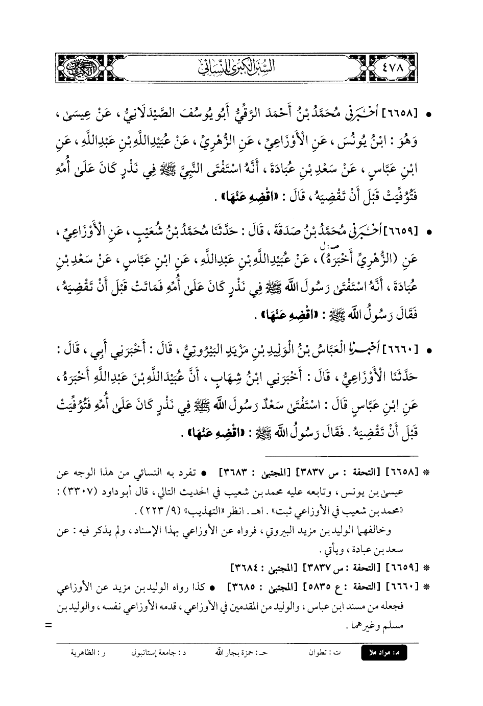 6658- أَخبَرني مُحَمدُ بنُ أَحْمَدَ الرَّقِّيُّ أَبو يُوسُفَ الصَّيْدَلانِيُّ، عَن عِيسَى، وَهُوَ ابنُ يُونُسَ، عَنِ الأَوْزَاعِيِّ، عَنِ الزُّهْرِيِّ، عَن عُبَيدِ اللهِ بنِ عَبدِ اللهِ، عَنِ ابنِ عَبَّاسٍ، عَن سَعْدِ بنِ عُبَادَةَ، أَنَّهُ اسْتَفْتَى النَّبيَّ صَلى الله عَليه وسَلم فِي نَذْرٍ كَانَ عَلَى أُمِّهِ، فَتُوُفِّيَتْ قَبْلَ أَنْ تَقْضِيَهُ، قَالَ: اقْضِهِ عَنهَا.