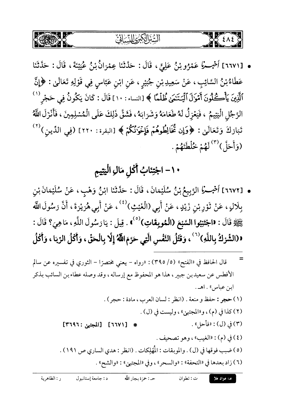 6671- أَخبَرنا عَمْرُو بنُ عَليٍّ، قَالَ: حَدثنا عِمْرَانُ بنُ عُيَيْنَةَ، قَالَ: حَدثنا عَطَاءُ بنُ السَّائِبِ، عَن سَعِيدِ بنِ جُبَيْرٍ، عَنِ ابنِ عَبَّاسٍ، فِي قَوْلِهِ تَعَالَى: {إِنَّ الَّذِينَ يَأْكُلُونَ أَمْوَالَ اليَتَامَى ظُلْمًا}، قَالَ: كَانَ يَكُونُ فِي حَجْرِ الرَّجُلِ اليَتِيمُ، فَيَعْزِلُ لَهُ طَعَامَهُ، وَشَرَابَهُ، فَشَقَّ ذَلِكَ عَلَى المُسْلِمِينَ، فَأَنْزَلَ اللهُ تَبَارَكَ وَتَعَالَى: {وَإِنْ تُخَالِطُوهُمْ فَإِخْوَانُكُمْ} في الدين، وَأَحَلَّ لَهُمْ خُلْطَتَهُمْ.