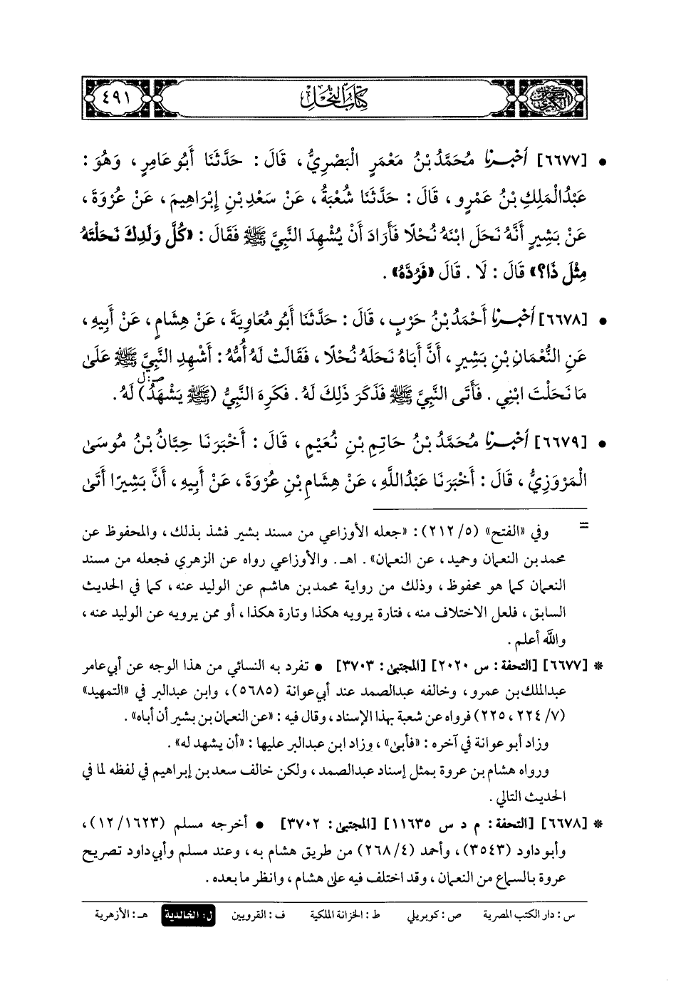 6677- أَخبَرنا مُحَمدُ بنُ مَعْمَرٍ البَصْرِيُّ، قَالَ: حَدثنا أَبو عَامِرٍ، وَهُوَ عَبدُ المَلِكِ بنُ عَمْرٍو، قَالَ: حَدثنا شُعبَةُ، عَن سَعْدِ بنِ إِبرَاهِيمَ، عَن عُرْوَةَ، عَن بَشِيرٍ، أَنَّهُ نَحَلَ ابنَهُ نُحْلاً، فَأَرَادَ أَنْ يُشْهِدَ النَّبيَّ صَلى الله عَليه وسَلم، فَقَالَ: كُلَّ وَلَدِكَ نَحَلْتَهُ مِثْلَ ذَا؟ قَالَ: لا، قَالَ: فَردهُ.